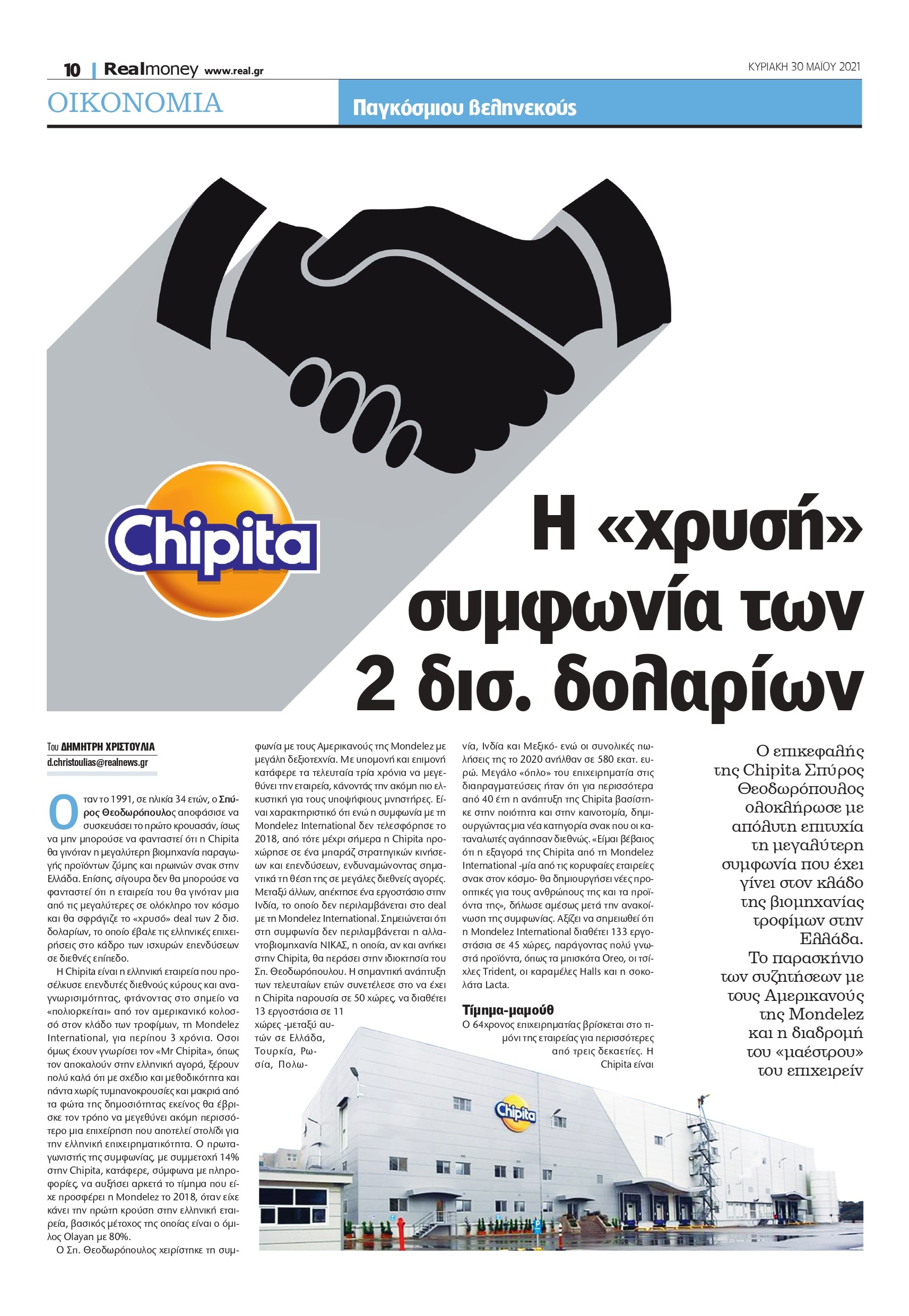 Όταν το 1991, σε ηλικία 34 ετών, ο Σπύρος Θεοδωρόπουλος αποφάσισε να συσκευάσει το πρώτο κρουασάν, ίσως να μην μπορούσε να φανταστεί ότι η Chipita θα γινόταν η μεγαλύτερη βιομηχανία παραγωγής προϊόντων ζύμης και πρωινών σνακ στην Ελλάδα. Επίσης, σίγουρα δεν θα μπορούσε να φανταστεί ότι η εταιρεία του θα γινόταν μια από τις μεγαλύτερες σε ολόκληρο τον κόσμο και θα σφράγιζε το «χρυσό» deal των 2 δισ. δολαρίων, το οποίο έβαλε τις ελληνικές επιχειρήσεις στο κάδρο των ισχυρών επενδύσεων σε διεθνές επίπεδο.