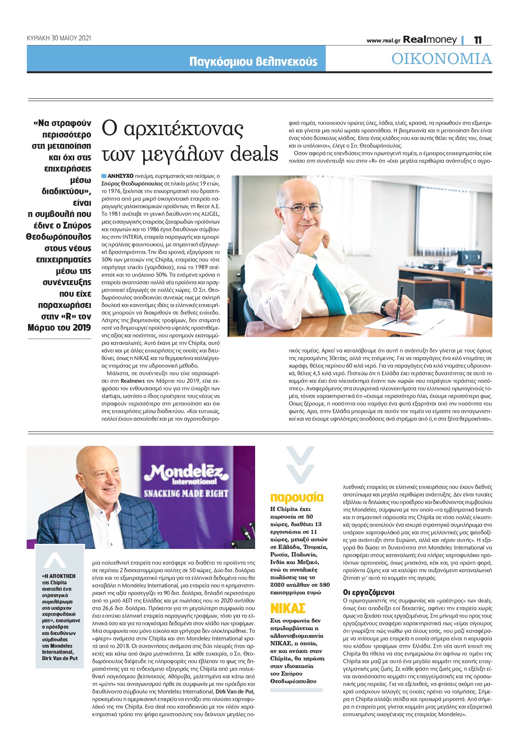 Ο Σπ. Θεοδωρόπουλος χειρίστηκε τη συμφωνία με τους Αμερικανούς της Mondelez με μεγάλη δεξιοτεχνία. Με υπομονή και επιμονή κατάφερε τα τελευταία τρία χρόνια να μεγεθύνει την εταιρεία, κάνοντάς την ακόμη πιο ελκυστική για τους υποψήφιους μνηστήρες. Είναι χαρακτηριστικό ότι ενώ η συμφωνία με τη Mondelez International δεν τελεσφόρησε το 2018, από τότε μέχρι σήμερα η Chipita προχώρησε σε ένα μπαράζ στρατηγικών κινήσεων και επενδύσεων, ενδυναμώνοντας σημαντικά τη θέση της σε μεγάλες διεθνείς αγορές. Μεταξύ άλλων, απέκτησε ένα εργοστάσιο στην Ινδία, το οποίο δεν περιλαμβάνεται στο deal με τη Mondelez International. Σημειώνεται ότι στη συμφωνία δεν περιλαμβάνεται η αλλαντοβιομηχανία ΝΙΚΑΣ, η οποία, αν και ανήκει στην Chipita, θα περάσει στην ιδιοκτησία του Σπ. Θεοδωρόπουλου.
