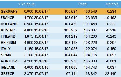 Βουλιάζουν σε αρνητικό επίπεδο τα επιτόκια των ομολόγων στην ευρωζώνη εκτός από την Ελλάδα (πίνακας: αποδόσεις 2ετών):