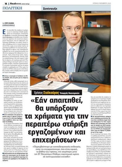 Οσον αφορά την ύφεση, ο Χρ. Σταϊκούρας ξεκαθαρίζει πως τα νέα περιοριστικά μέτρα που τίθενται σε εφαρμογή θα επιβαρύνουν την οικονομία. «Εμείς, όπως έχουμε χρέος, παρεμβαίνουμε με αποτελεσματικές πολιτικές, ώστε να συγκρατήσουμε, όσο είναι εφικτό, το βάθος της ύφεσης, στη χειρότερη μετά τον Β’ Παγκόσμιο Πόλεμο οικονομική κρίση σε πανευρωπαϊκό επίπεδο», σημειώνει χαρακτηριστικά. Ο υπουργός Οικονομικών μιλά για τα μέτρα στήριξης, το μαξιλαράκι των 37 δισ. ευρώ, την κριτική του ΣΥΡΙΖΑ, αλλά και το πότε θα έρθει το πρώτο πακέτο στήριξης από το ευρωπαϊκό Ταμείο Ανάκαμψης.