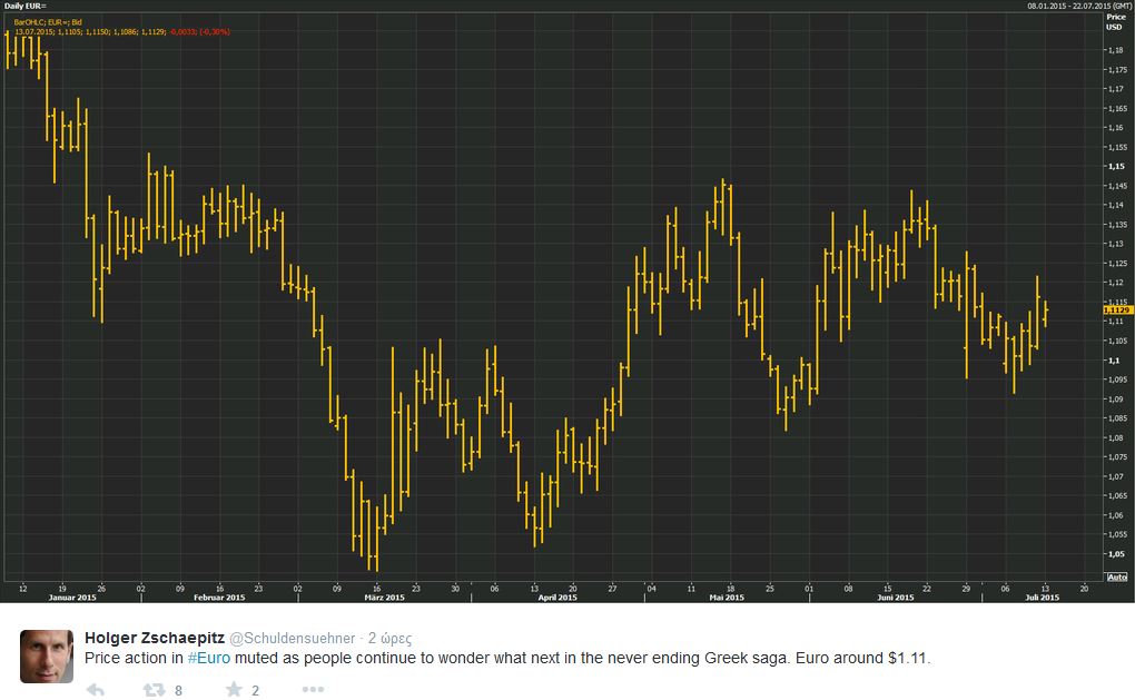 Στις 04:00 ώρα Γκρίνουιτς (07:00 ώρα Ελλάδας), λίγο μετά την ανακοίνωση ενός συμβιβαστικού σχεδίου που τέθηκε στο τραπέζι από τη Γαλλία, τη Γερμανία και την Ελλάδα, το Τόκιο σημείωνε άνοδο 1,50%, το Σίδνεϊ 0,64%, η Σεούλ 1,25% και το Χονγκ Κονγκ 0,22%.
