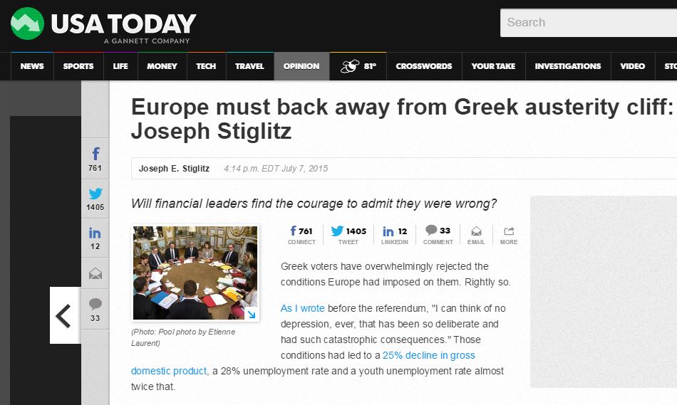 «Η μπάλα βρίσκεται τώρα στο γήπεδο των Ευρωπαίων ηγετών. Το ερώτημα είναι, θα επιμείνουν σε μια πολιτική που έχει αποδειχθεί καταστροφική; Ή θα συνδυάσουν την επιθυμία να διατηρήσουν το ευρώ, με καλές οικονομικές πολιτικές και σεβασμό στην δημοκρατία ; Μπορούν να μεταρρυθμίσουν το πακέτο μεταρρυθμίσεων ;» γράφει ο κ. Στίγκλιτς.