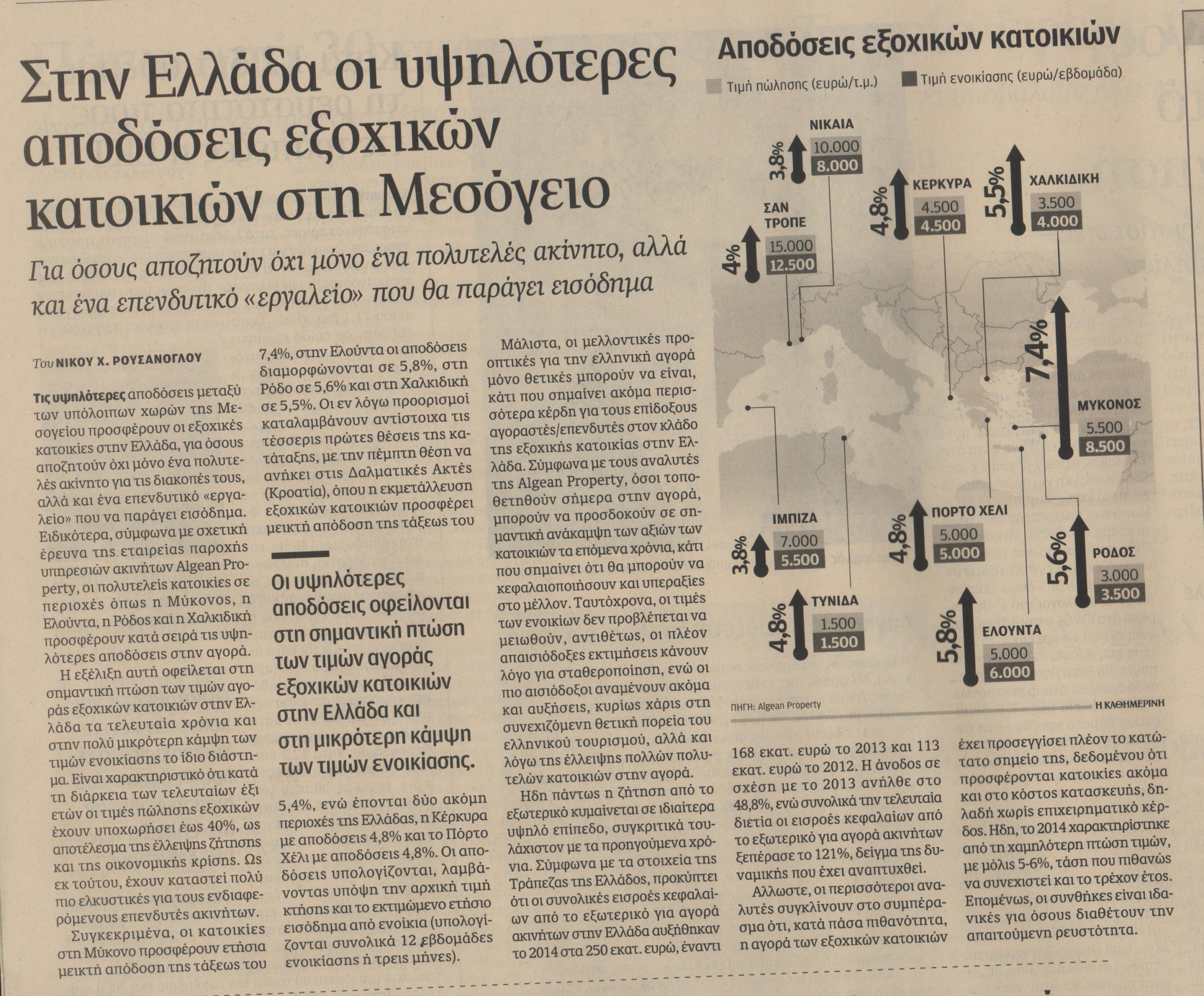 Τις υψηλότερες αποδόσεις μεταξύ των υπόλοιπων χωρών της Μεσογείου προσφέρουν οι εξοχικές κατοικίες στην Ελλάδα, για όσους αποζητούν όχι μόνο ένα πολυτελές ακίνητο για τις διακοπές τους, αλλά και ένα επενδυτικό «εργαλείο» που να παράγει εισόδημα.