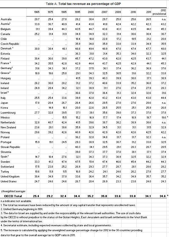 Σύμφωνα με τον ΟΟΣΑ, το μέσο φορολογικό βάρος αυξήθηκε κατά 0,5 ποσοστιαίες μονάδες στο 34,6% το 2012, μετά από αυξήσεις 0,2 και 0,3 ποσοστιαίων μονάδων το 2010 και 2011, αντιστρέφοντας την πτώση από το 35% στο 33,6% που κατεγράφη από το 2007 μέχρι το 2009.