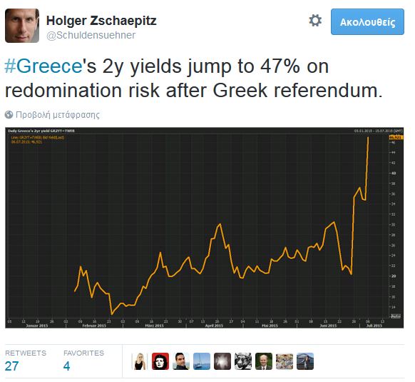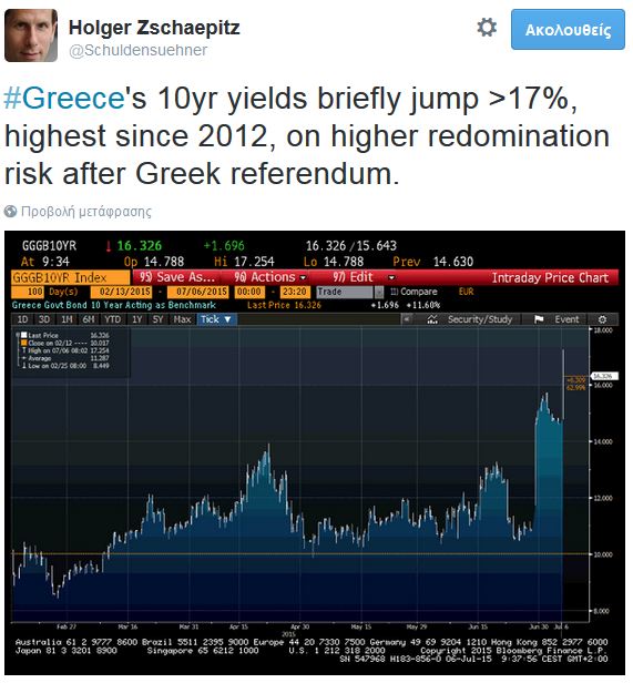 Μεγάλη πτώση καταγράφουν τα ευρωπαϊκά χρηματιστήρια και το ευρώ υποχωρεί, καθώς το «όχι» στο ελληνικό δημοψήφισμα ώθησε τους επενδυτές να κινηθούν προς τα “ασφαλή καταφύγια” των γερμανικών και αμερικανικών ομολόγων και του γεν, μεταδίδει το Bloomberg. Ωστόσο παρουσιάζονται πιο προσεκτικές κινήσεις ανάκτησης του χαμένου έδαφους μετά την παραίτηση Βαρουφάκη.