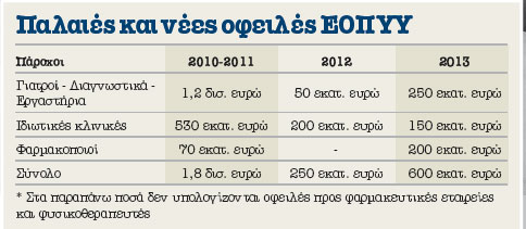 Πιο ευχαριστημένοι πάροχοι είναι οι φαρμακοποιοί, καθώς ο Οργανισμός είναι συνεπής στις πληρωμές του. Το… σερί, ωστόσο, έσπασε και τους οφείλει 200 εκατομμύρια ευρώ για συνταγές του περασμένου Μαρτίου.