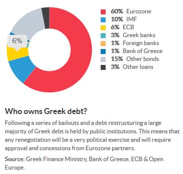 Θέτει το ερώτημα μπορεί να κάνει η Ελλάδα στάση πληρωμών στα ευρωπαϊκά δάνεια (EKT, EFSF) ή στο ΔΝΤ και να παραμείνει στο ευρωσύστημα; Παρουσιάζει σε διάγραμμα ότι στην ευρωζώνη ανήκει σχεδόν το 60% του χρέους της Ελλάδας με το συνολικό πακέτο να φτάνει τα 320 δισ. ευρώ.