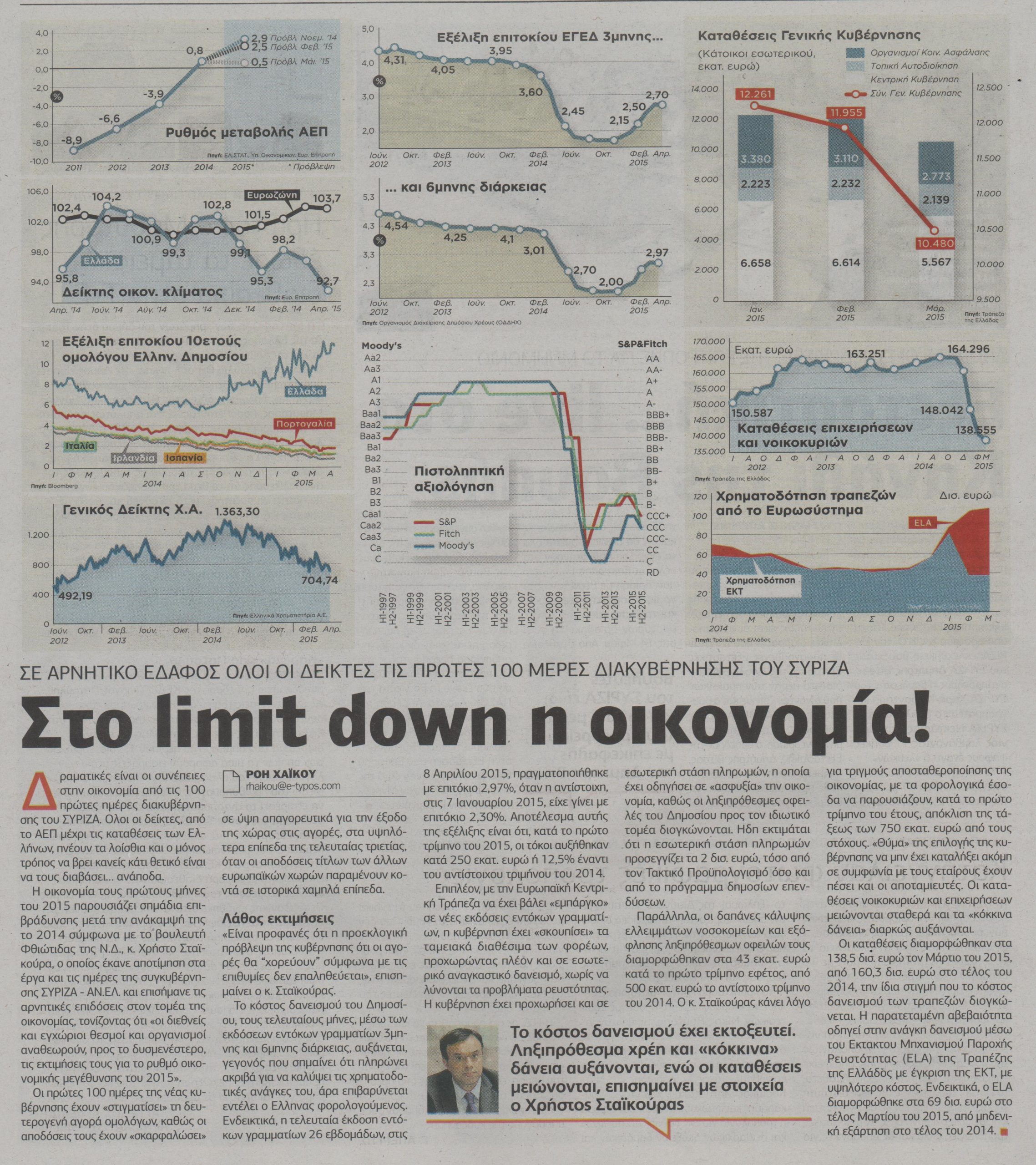 Η οικονομία τους πρώτους μήνες του 2015 παρουσιάζει σημάδια επιβράδυνσης μετά την ανάκαμψή της το 2014 σύμφωνα με το βουλευτή Φθιώτιδας της Ν.Δ. Χρήστο Σταϊκούρα, ο οποίος έκανε αποτίμηση στα έργα και τις ημέρες της συγκυβέρνησης ΣΥΡΙΖΑ- ΑΝ.ΕΛ. και επισήμανε τις αρνητικές επιδόσεις στον τομέα της οικονομίας, τονίζοντας ότι “οι διεθνείς και εγχώριοι θεσμοί και οργανισμοί αναθεωρούν, προς το δυσμενέστερο, τις εκτιμήσεις τους για το ρυθμό οικονομικής μέγέθυνσης του 2015”.