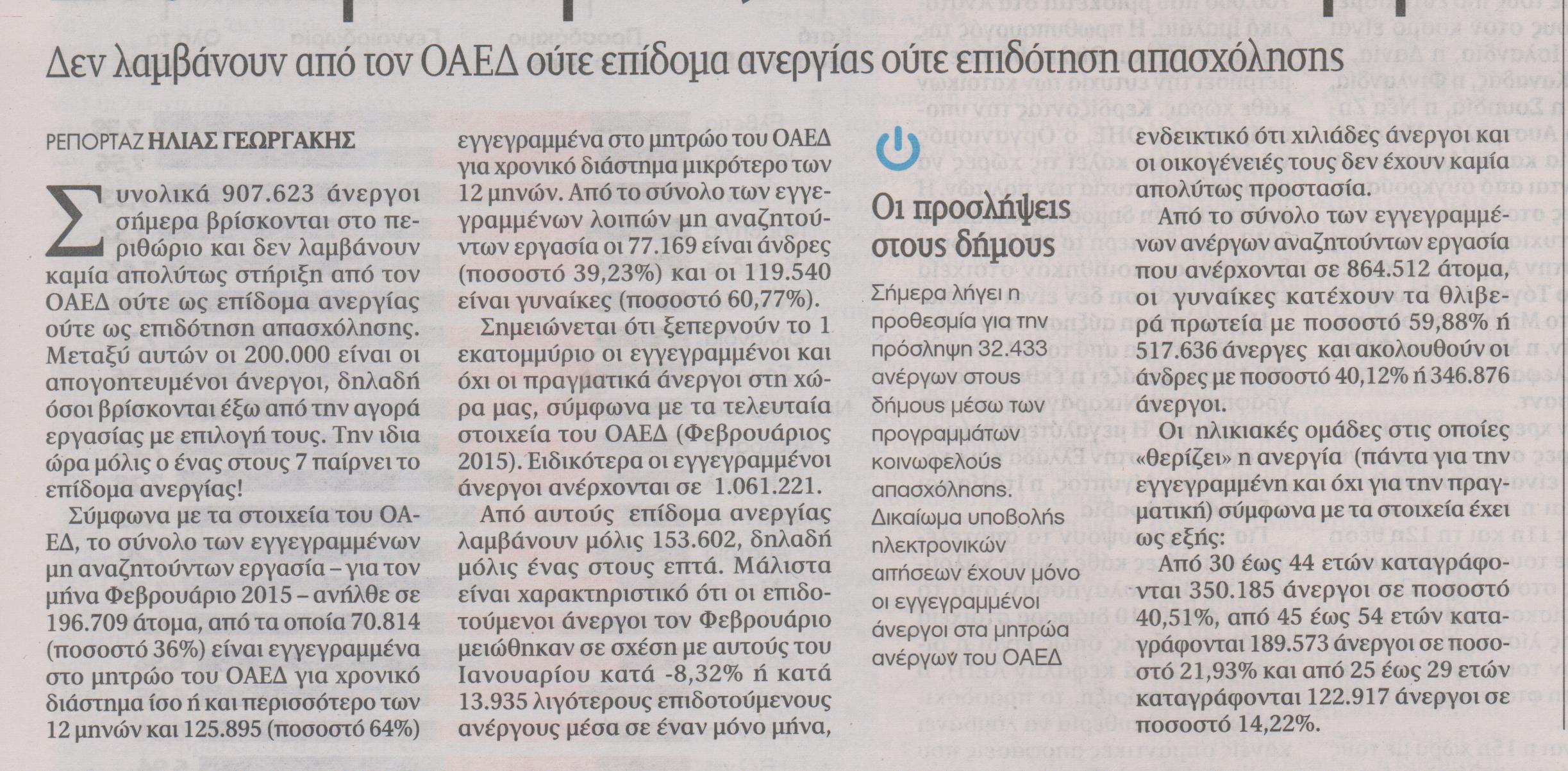 Συνολικά 907.623 άνεργοι σήμερα βρίσκονται στο περιθώριο και δεν λαμβάνουν καμία απολύτως στήριξη από τον ΟΑΕΔ ούτε ως επίδομα ανεργίας ούτε ως επιδότηση απασχόλησης.