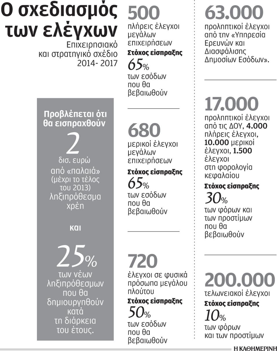 – 17.000 προληπτικοί έλεγχοι από τις ΔΟΥ, 4.000 πλήρεις έλεγχοι, 10.000 μερικοί έλεγχοι, 1.500 έλεγχοι στη φορολογία κεφαλαίου. Ο στόχος είναι να εισπραχθεί το 30% των φόρων και των προστίμων που θα βεβαιωθούν.