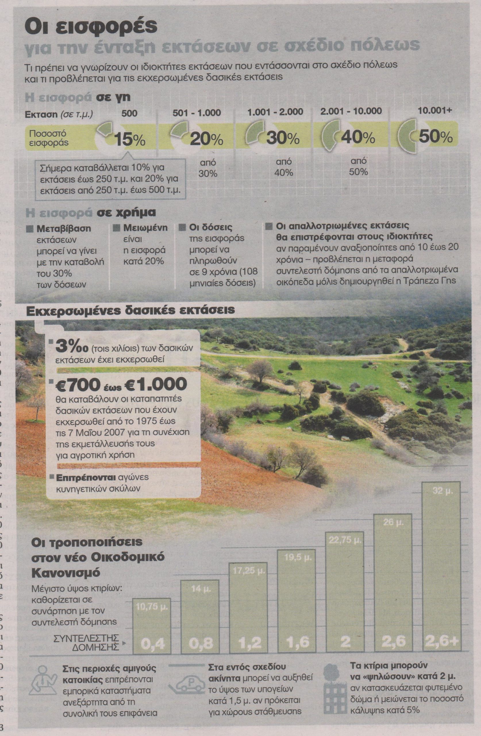 Με το σχέδιο νόμου που αναμένεται να κατατεθεί το επόμενο διάστημα στη Βουλή από τον αναπληρωτή υπο��ργό Περιβάλλοντος Νίκο Ταγαρά, προβλέπεται μείωση των εισφορών σε χρήμα κατά 20% για τις εκτάσεις που εντάσσονται στο σχέδιο πόλεως. Επιπλέον αυτές οι εκτάσεις μπορούν να μεταβιβαστούν αν οι ιδιοκτήτες έχουν εξοφλήσει το 30% της εισφοράς σε χρήμα.