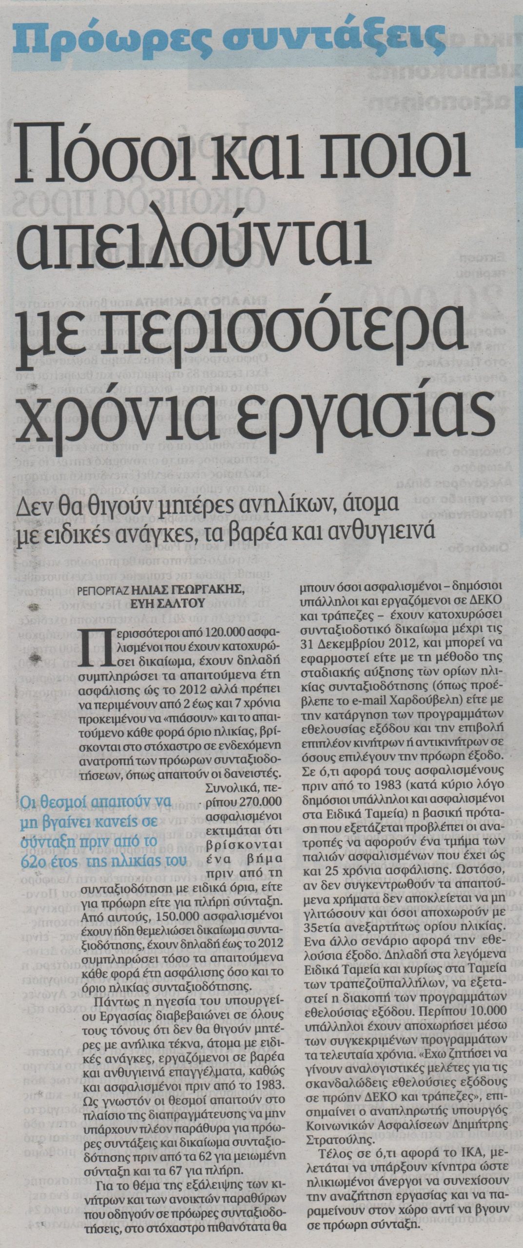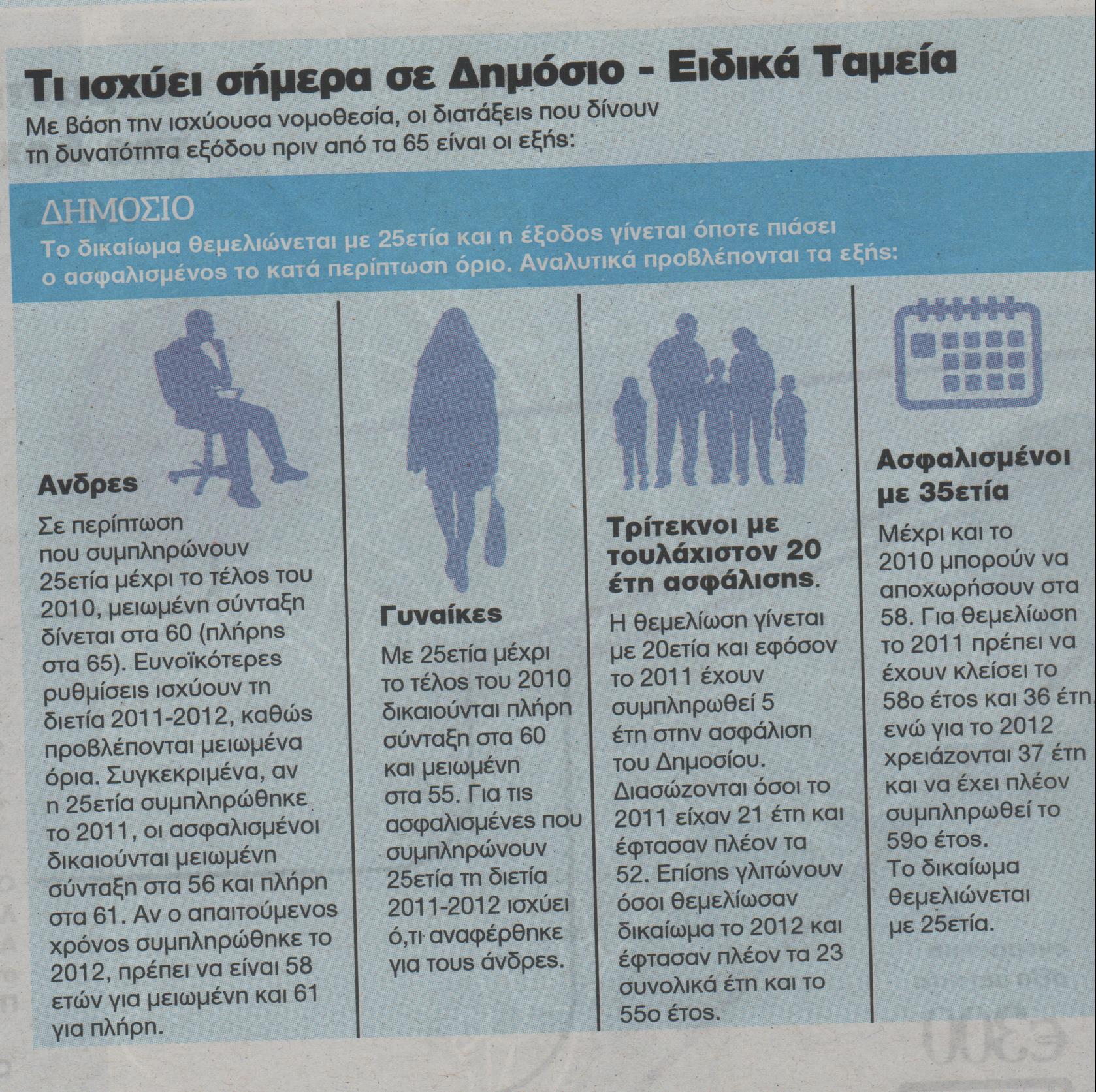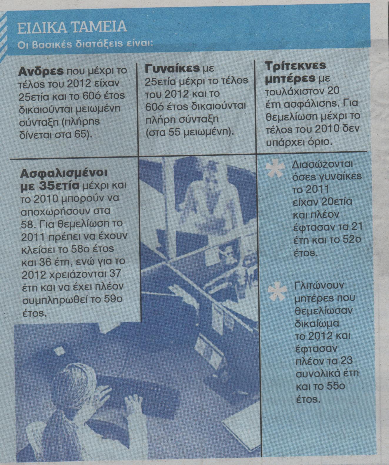 Πάντως η ηγεσία του υπουργείου Εργασίας διαβεβαιώνει σε όλους τους τόνους ότι δεν θα θιγούν μητέρες με ανήλικα τέκνα, άτομα με ειδικές ανάγκες, εργαζόμενοι σε βαρέα και ανθυγιεινά επαγγέλματα, καθώς και ασφαλισμένοι πριν από το 1983.