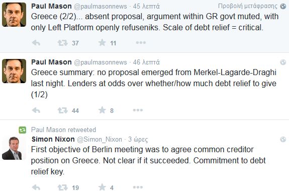 Ο Πολ Μέισον αρθρογράφος στο Channel 4 γράφει μια τηλεγραφική σύνοψη σε δυο tweet: «δεν προέκυψε κάποια πρόταση από Μέρκελ-Λαγκάρντ-Ντράγκι χθες το βράδυ. Οι δανειστές διαφωνούν εάν θα προτείνουν ελάφρυνση χρέους και αν ναι πόσο… Ελλάδα:… απούσα πρόταση, σιγή σχολίων εντός ελληνικής κυβέρνησης, μόνο η Αριστερή Πλατφόρμα είναι ανοιχτά αρνητική. Κρίσιμη είναι η κλίμακα ελάφρυνσης του χρέους …».