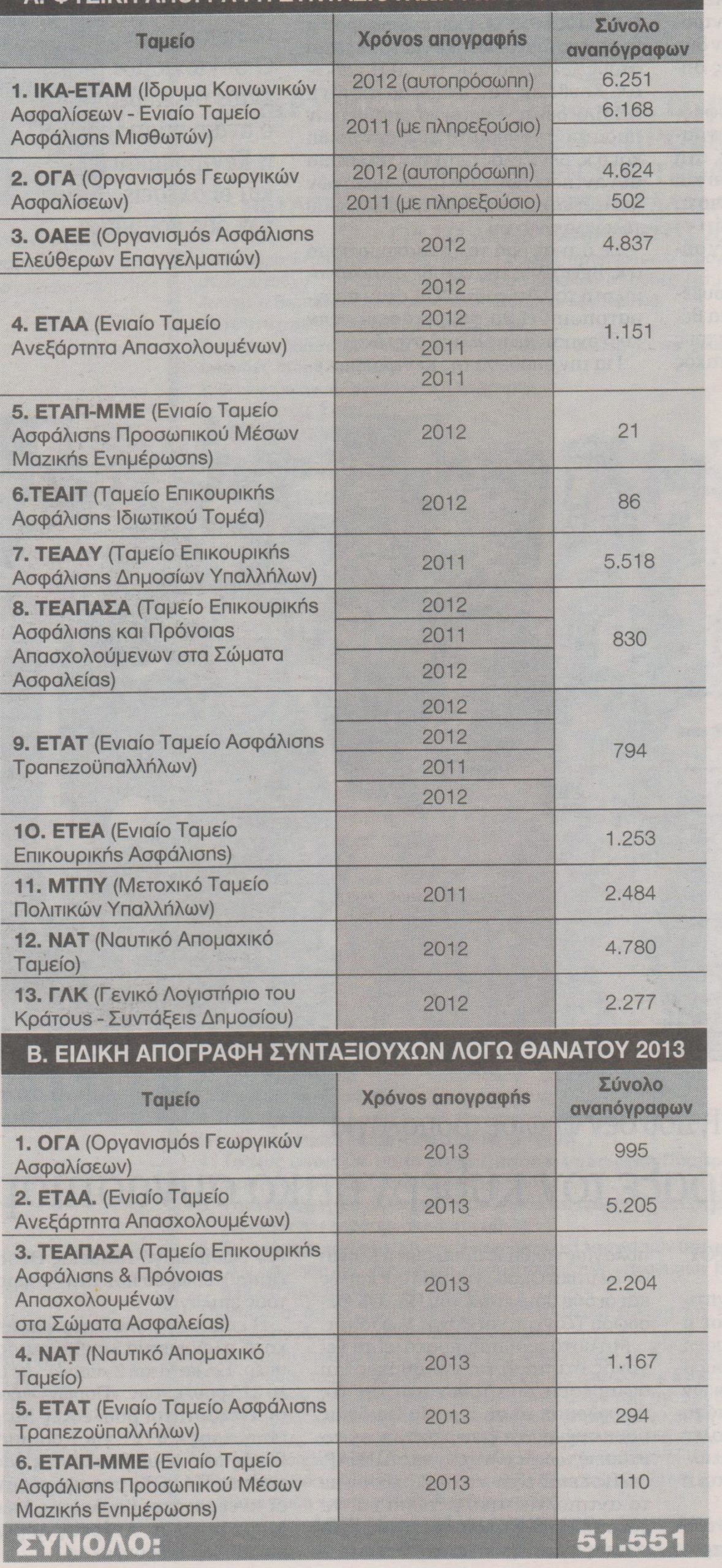 Κατά τη διάρκεια της συζήτησης επί της αρχής του νομοσχεδίου-σκούπα του υπουργείου Εργασίας για την αντιμετώπιση της παραβατικότητας εις βάρος του ασφαλιστικού συστήματος, ο κ. Βρούτσης κατέθεσε τα αναλυτικά στοιχεία που δείχνουν το μέγεθος της απάτης ανά ασφαλιστικό φορέα και Ταμείο. Το σύνολο εκείνων που ελάμβαναν συντάξεις από το ΙΚΑ – ΕΤΑΜ και δεν απογράφηκαν ανέρχεται σε 6.251 το 2012 και σε 6.168 το 2011, στον ΟΓΑ το 2012 οι αναπόγραφοι ανήλθαν σε 4.624 και το 2011 σε 502. Στον ΟΑΕΕ οι αναπόγραφοι ανήλθαν συνολικά σε 1.151, στο ΕΤΑΠ – ΜΜΕ σε 21, στο ΤΕΑΙΤ (Ταμείο Επικουρικής Ασφάλισης Ιδιωτικού Τομέα) 86, στο ΤΕΑΔΥ οι αναπόγραφοι ανέρχονται σε 5.518, στο ΤΕΑΠΑΣΑ σε 830, στο ΕΤΑΤ σε 794, στο ΕΤΕΑ σε 1.253, στο ΜΤΠΥ σε 2.484, στο ΝΑΤ σε 4.780, στο Γενικό Λογιστήριο του Κράτους (συντάξεις Δημοσίου) σε 2.277 αναπόγραφους.