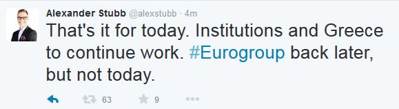 Την ολοκλήρωση της συνεδρίασης του Eurogroup για σήμερα ανακοίνωσε ο υπουργός Οικονομικών της Φινλανδίας Αλεξάντερ Στουμπ, με ανάρτηση που έκανε στον λογαριασμό του στο Twitter. Μάλιστα ο ίδιος έγραψε ότι θα υπάρξει συνέχεια στο Eurogroup, αλλά διευκρίνισε ότι κάτι τέτοιο δεν θα γίνει σήμερα.