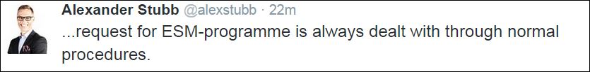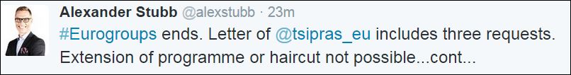 Το «όχι» των υπουργών Οικονομικών της Ευρωζώνης για την παράταση του προγράμματος και για κούρεμα του χρέους ανακοίνωσε μέσω twitter ο Φινλανδός υπουργός Οικονομικών, Αλεξάντερ Στουμπ.