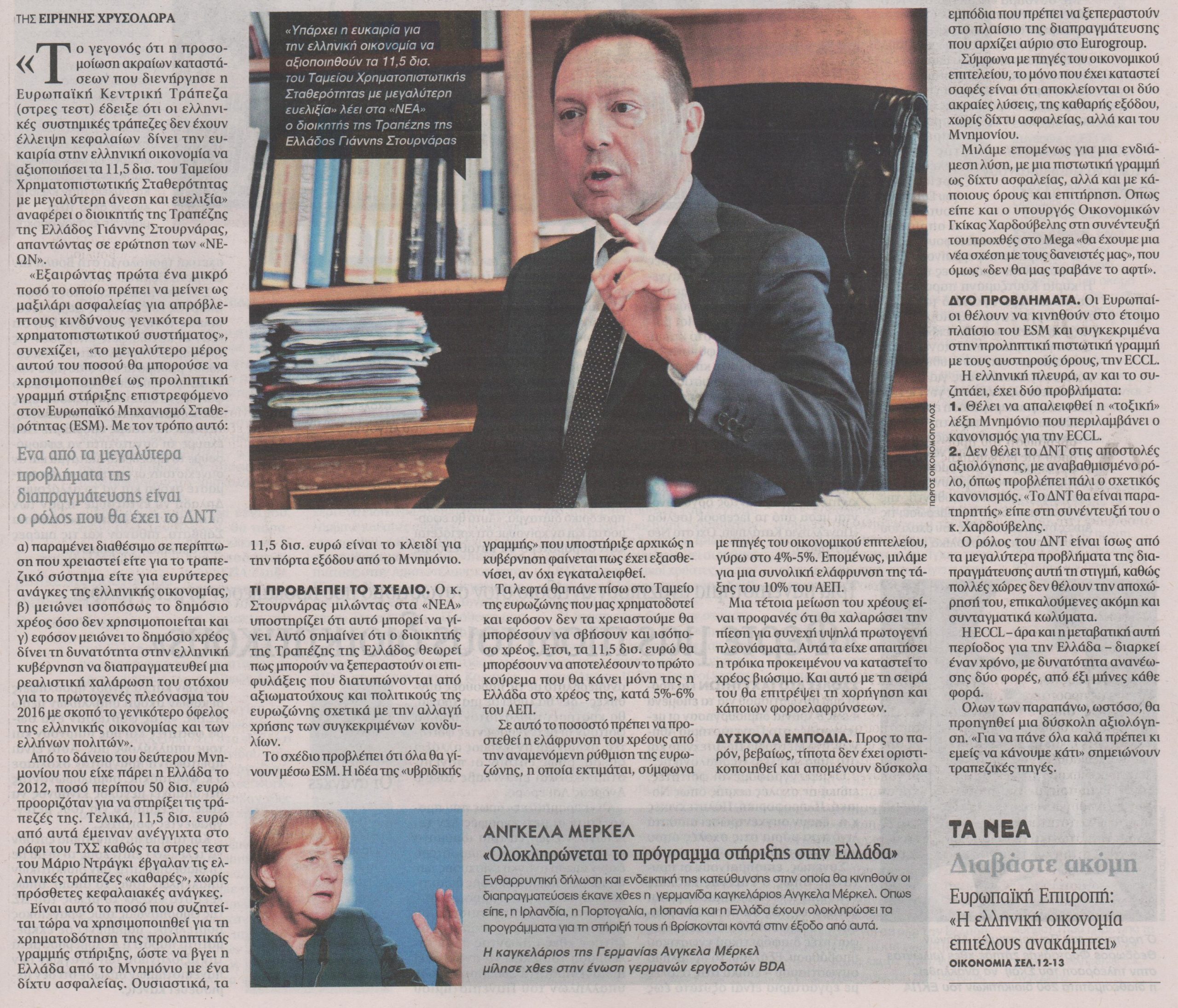 «Το γεγονός ότι η προσομοίωση ακραίων καταστάσεων που διενήργησε η Ευρωπαϊκή Κεντρική Τράπεζα (στρες τεστ) έδειξε ότι οι ελληνικές συστημικές τράπεζες δεν έχουν έλλειψη κεφαλαίων, δίνει την ευκαιρία στην ελληνική οικονομία να αξιοποιήσει τα 11,5 δισεκ. ευρώ του Ταμείου Χρηματοπιστωτικής Σταθερότητας με μεγαλύτερη άνεση και ευελιξία» αναφέρει ο διοικητής της Τράπεζας της Ελλάδος, Γιάννης Στουρνάρας, απαντώντας σε ερώτηση των Νέων.