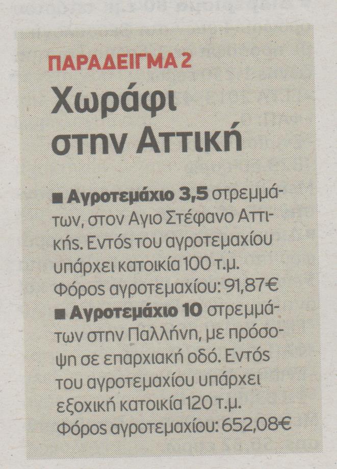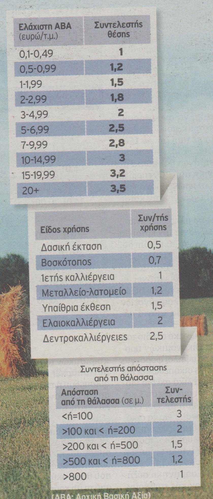 Ειδικότερα, για τα αγροτεμάχια και τις λοιπές εκτάσεις γης που βρίσκονται εκτός σχεδίου, θα εφαρμόζεται ένας βασικός συντελεστής φορολογίας (ΒΣΦ), ο οποίος ορίζεται σε 0,0015 ευρώ ανά τετραγωνικό μέτρο ή 1,5 ευρώ το στρέμμα.