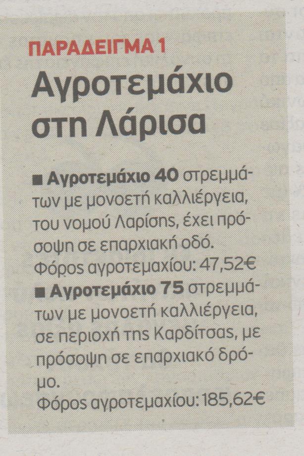 Στην τσιμπίδα της εφορίας πέφτουν, για πρώτη φορά, τα αγροτεμάχια. Με τη θεσμοθέτηση του ενιαίου φόρου ακινήτων, για πρώτη φορά, επιβάλλεται «στρεμματικός»φόρος για καλλιεργούμενες εκτάσεις, αγρούς, βοσκοτόπια και λοιπές εκτός σχεδίου εκτάσεις.