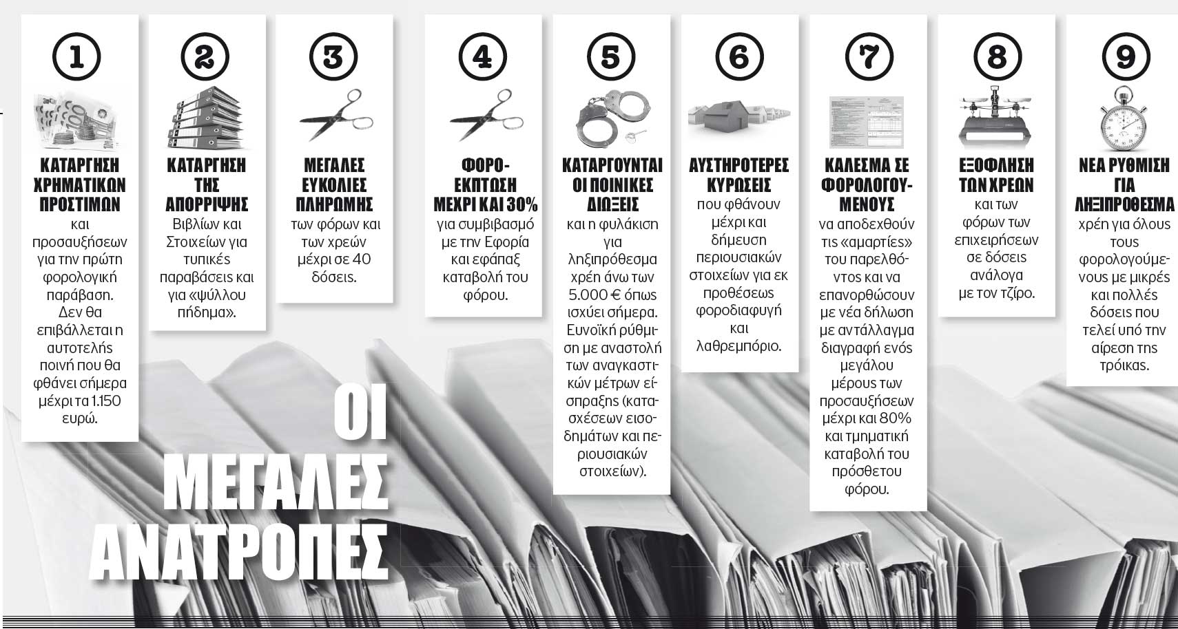 Επιχείρηση «ξήλωμα» του ποινολογίου της εφορίας ξεκινά το υπουργείο Οικονομικών, με πυξίδα το νέο δόγμα που προβλέπει αντί για διώξεις και εξοντωτικές φoρο-ποινές και πρόστιμα, την υπογραφή «συμβολαίου ειλικρίνειας» με την εφορία με αντάλλαγμα πλούσιες δόσεις και απαλλαγές από χρηματικά πρόστιμα και προσαυξήσεις.Το σχέδιο προβλέπει, μεταξύ άλλων, και κατάργηση των ποινικών διώξεων και φυλακίσεων για ληξιπρόθεσμα χρέη στο Δημόσιο που σήμερα ενεργοποιούνται για οφειλή άνω των 5.000 ευρώ και δυνατότητα τμηματικής καταβολής τους ανάλογα με την εισοδηματική και περιουσιακή κατάσταση του φορολογούμενου και, σε περίπτωση επιχείρησης, ανάλογα με τον τζίρο της.Στην αντίπερα όχθη αυστηροποιούνται οι κυρώσεις για εκ προθέσεως φοροδιαφυγή και λαθρεμπόριο φθάνοντας μέχρι και τη δήμευση περιουσιακών στοιχείων.Το σχέδιο του υπουργείου Οικονομικών για το νέο ποινολόγιο, που αναμένεται να τεθεί σε ισχύ μέχρι τις αρχές του έτους, περιλαμβάνει τις ακόλουθες ανατροπές.- Κατάργηση των αυτοτελών χρηματικών προστίμων για την πρώτη φορολογική παράβαση. Δεν θα επιβάλλεται η αυτοτελής ποινή που φθάνει σήμερα μέχρι τα 1.150 ευρώ όταν διαπιστώνεται για πρώτη φορά φορολογική παράβαση ανεξάρτητα από το είδος και την έκταση, υπό την προϋπόθεση ότι δεν στοιχειοθετείται πρόθεση για φοροδιαφυγή.Μεταξύ των περιπτώσεων για κατάργηση των προστίμων είναι η έκδοση αθεώρητων φορολογικών στοιχείων εκ παραδρομής, η μη έκδοση στοιχείου για συναλλαγή όπως τιμολόγιο, απόδειξη παροχής, δελτίο αποστολής κ.ά. όταν υπάρχει άλλο αντίστοιχο στοιχείο, η διαπίστωση τυπικών παραβάσεων που δεν επηρεάζουν έσοδα και έξοδα.- Δεν θα απορρίπτονται από τους ελεγκτές τα Βιβλία και Στοιχεία για τυπικές παραβάσεις και για «ψύλλου πήδημα», ενώ από το 2013 θα καταργηθεί ο απαρχαιωμένος Κώδικας Βιβλίων και Στοιχείων και θα αντικατασταθεί με την ηλεκτρονική καταγραφή των εσόδων – εξόδων.- Διαγραφή ενός μεγάλους μέρους των προσαυξήσεων μέχρι και 80% και τμηματική καταβολή του πρόσθετου φόρου ακόμα σε 40 δόσεις για τους φορολογούμενους που θα αποδεχτούν τις «φορολογικές αμαρτίες» του παρελθόντος και θα υποβάλουν νέα ή συμπληρωματική δήλωση.Το μέτρο αφορά περιπτώσεις φορολογούμενων οι οποίοι δεν έχουν υποβάλει δηλώσεις ή έχουν υποβάλει ανακριβείς δηλώσεις και οι οποίοι θα υποβάλουν αρχικές, διορθωτικές ή συμπληρωματικές δηλώσεις αποδεχόμενοι τον πρόσθετο φόρο που πρέπει να καταβάλουν για τα παρελθόντα έτη (δηλώσεις φορολογίας εισοδήματος, ΦΠΑ, φόρου υπεραξίας, μεταβίβασης ή αυτομάτου υπερτιμήματος ή τέλος συναλλαγής ακινήτων, κληρονομιών, δωρεών, γονικών παροχών κ.ά.).Το σπάσιμο του φόρου σε δόσεις θα είναι ανάλογο του χρόνου γέννησης της υποχρέωσης, το είδος και το ύψος του φόρου, τις οικονομικές αντοχές του φορολογούμενου και το ιστορικό του. Για οφειλές από φόρο εισοδήματος και ακινήτων που αφορούν το τρέχον έτος, οι δόσεις θα είναι λιγότερες συγκριτικά με χρέη που έχουν ήδη εδώ και πολλά χρόνια καταστεί ληξιπρόθεσμα.- Ακύρωση των μέτρων αναγκαστικής είσπραξης εσόδων, όπως κατασχέσεις εισοδημάτων και περιουσιακών στοιχείων, καθώς και των ποινικών διώξεων για όσους έλθουν σε συμφωνία διακανονισμού των υποχρεώσεών τους (οικειοθελής συμμόρφωση), με εξαίρεση προκλητικές περιπτώσεις φοροδιαφυγής και ξεπλύματος «μαύρου χρήματος».Επίσης, σε περίπτωση εφάπαξ εξόφλησης του συνολι