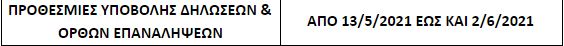Δίνεται η δυνατότητα υποβολής των δηλώσεων «ΑΙΤΗΣΗ / ΔΗΛΩΣΗ ΕΝΤΑΞΗΣ ΣΤΟΝ ΜΗΧΑΝΙΣΜΟ «ΣΥΝ-ΕΡΓΑΣΙΑ» (Β΄- ΦΑΣΗ)» και «ΑΙΤΗΣΗ / ΔΗΛΩΣΗ ΕΝΤΑΞΗΣ ΣΤΟΝ ΜΗΧΑΝΙΣΜΟ «ΣΥΝ-ΕΡΓΑΣΙΑ» (Β΄ – ΦΑΣΗ) – ΟΡΘΗ ΕΠΑΝΑΛΗΨΗ» για τον μήνα Μάιο 2021, εντός της κάτωθι προθεσμίας:
