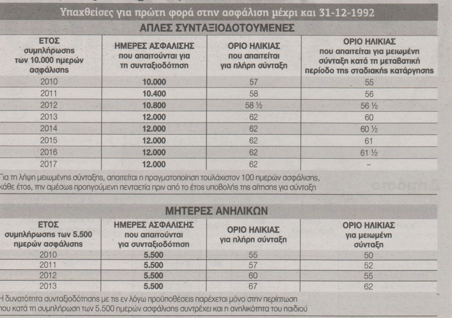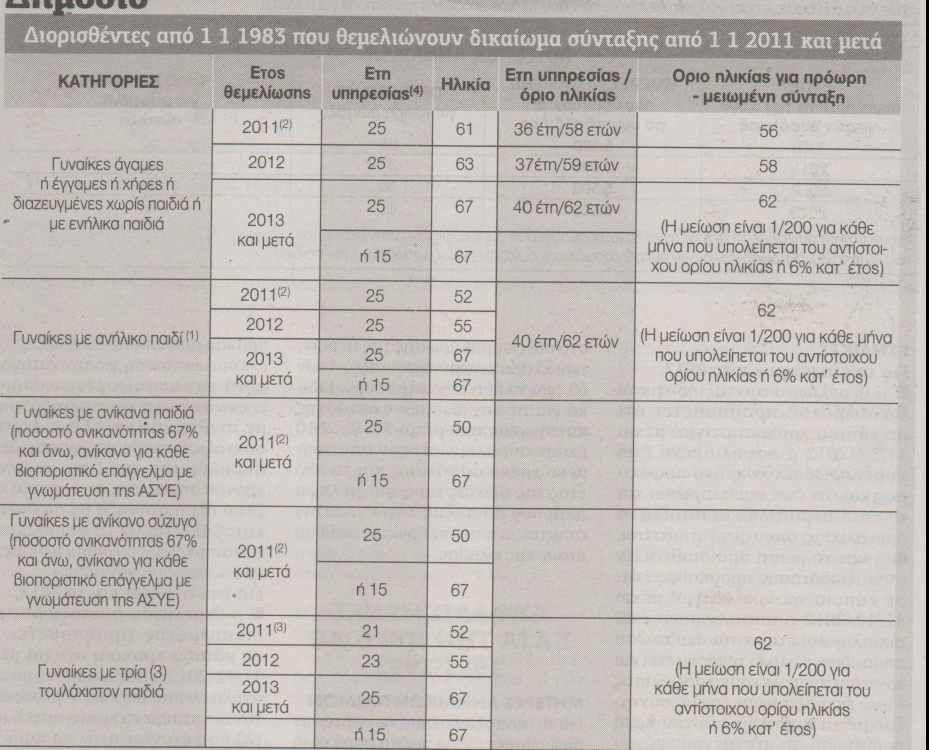 Από την 1/1/2013 επήλθε δυσμενής μεταβολή στις προϋποθέσεις συνταξιοδότησης και των γυναικών. Θα πρέπει, πάντως, να επισημανθεί ότι με τη νέα νομοθεσία διασφαλίζονται τα θεμελιωμένα έως 31/12/2012 και τα συνταξιοδοτικά δικαιώματα που έχουν κατοχυρωθεί ή κατοχυρώνονται, με ή χωρίς αναγνώριση πλασματικών χρόνων.