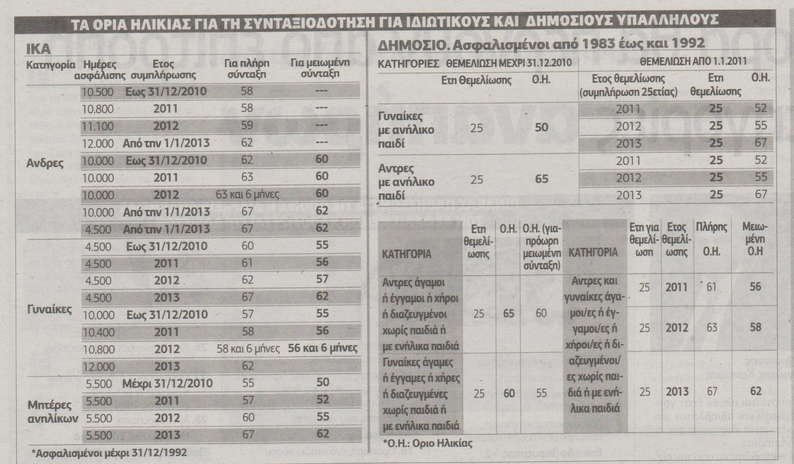 Συγκεκριμένα από 1ης Ιανουαρίου 2013 πλήρης σύνταξη καταβάλλεται στα 67 και μειωμένη στα 62 (εναλλακτικά πλήρης σύνταξη στα 62, αλλά με 40 έτη ασφάλισης).