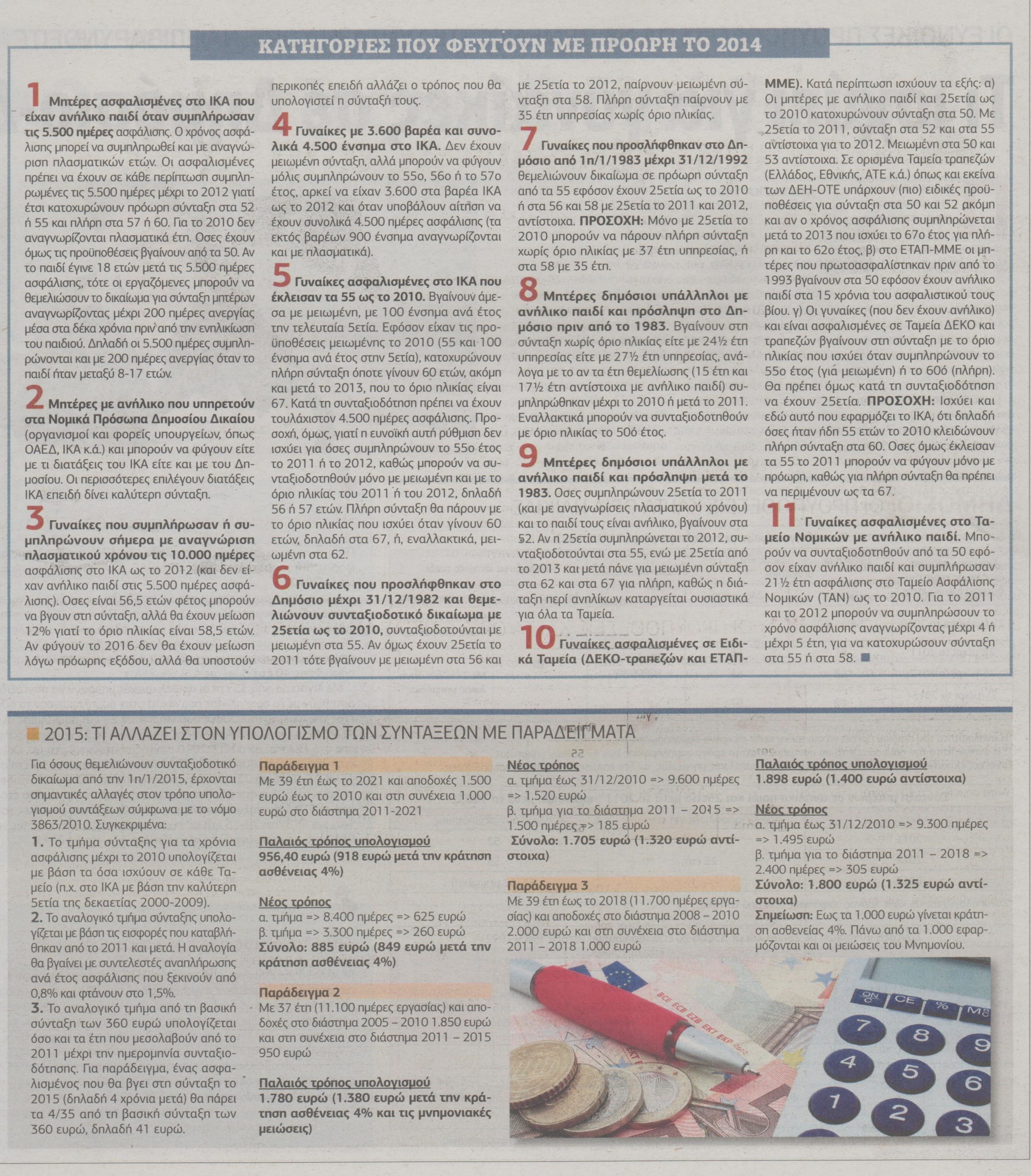 Σύνταξη από την πέμπτη δεκαετία τους χωρίς να επηρεαστούν από την αύξηση των ορίων ηλικίας και κυρίως γλιτώνοντας τις δυσμενείς αλλαγές στον υπολογισμό των ποσών που θα ισχύσουν από το 2015 και μετά μπορούν να κατοχυρώσουν, σύμφωνα με τον Ελεύθερο Τύπο, το 2014 οι γυναίκες που είχαν την πρώτη έναρξη της ασφάλισης τους σε ΙΚΑ, Δημόσιο και Ειδικά Ταμεία μισθωτών (ΔΕΚΟ, τραπεζών, κ.α. ) μέχρι τις 31/12/1992.