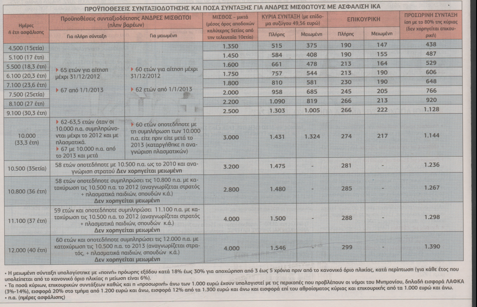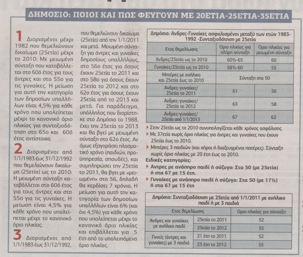 - Με 35ετία χωρίς όριο ηλικίας, παλαιοί μέχρι 1982 ασφαλισμένοι σε Δημόσιο και ειδικά Ταμεία (ΔΕΚΟ, τράπεζες, Ταμεία Τύπου) και κυρίως όσοι (Δημόσιο) είχαν κλείσει την 25ετία από το 1998 μέχρι το 2007. Στην κατηγορία αυτή ανήκουν 250.000 και πλέον ασφαλισμένοι.