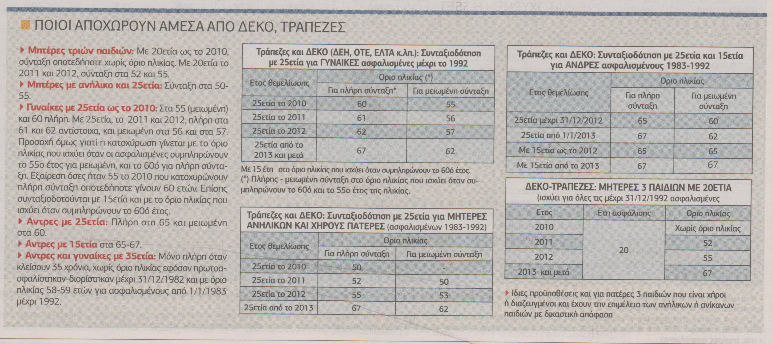 - Με 20ετία και 3 παιδιά (Δημόσιο, ΔΕΚΟ, τράπεζες). Στην κατηγορία αυτή ανήκουν περισσότεροι από 90.000 ασφαλισμένοι με την προϋπόθεση να είχαν την 20ετία ως το 2010 για σύνταξη χωρίς όριο ηλικίας. Με 20ετία από το 2011, σύνταξη στα 50 (ΔΕΚΟ) και από τα 52 (Δημόσιο).