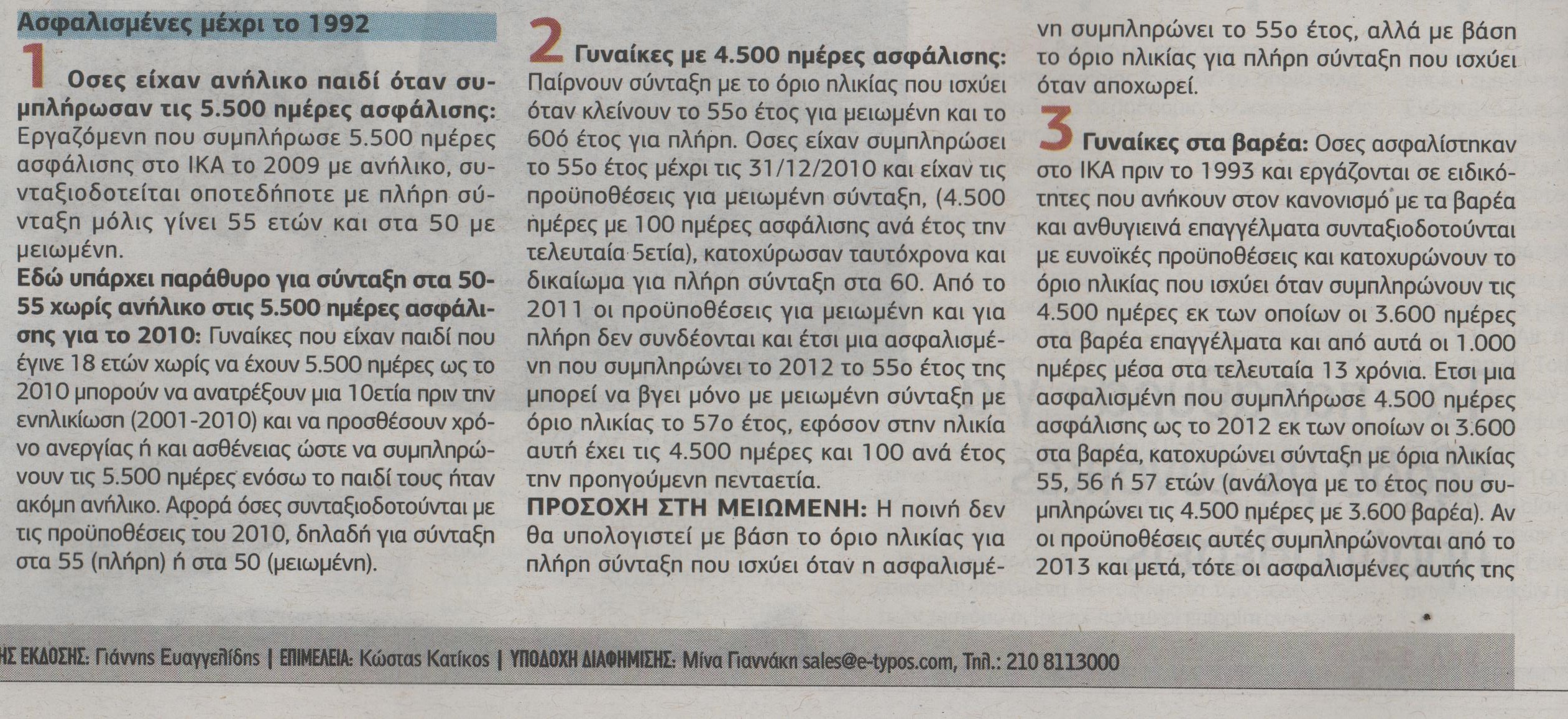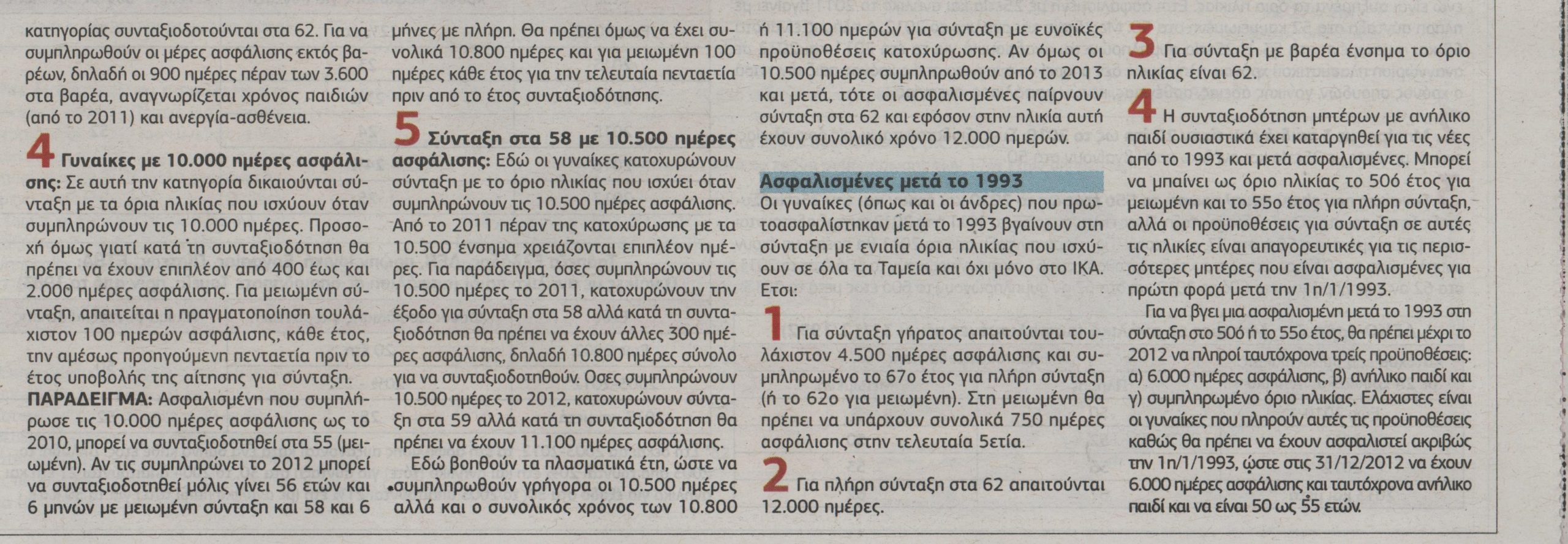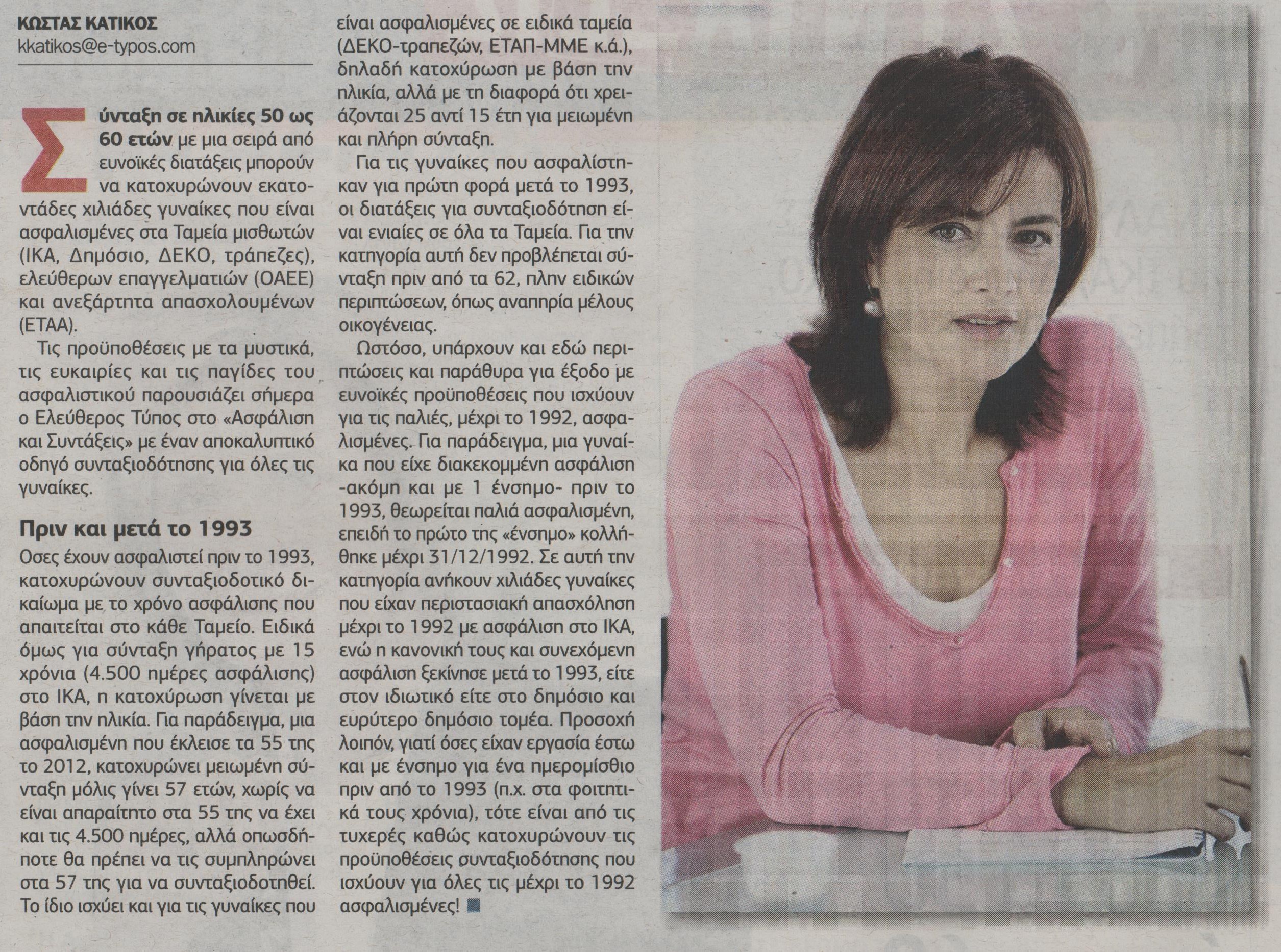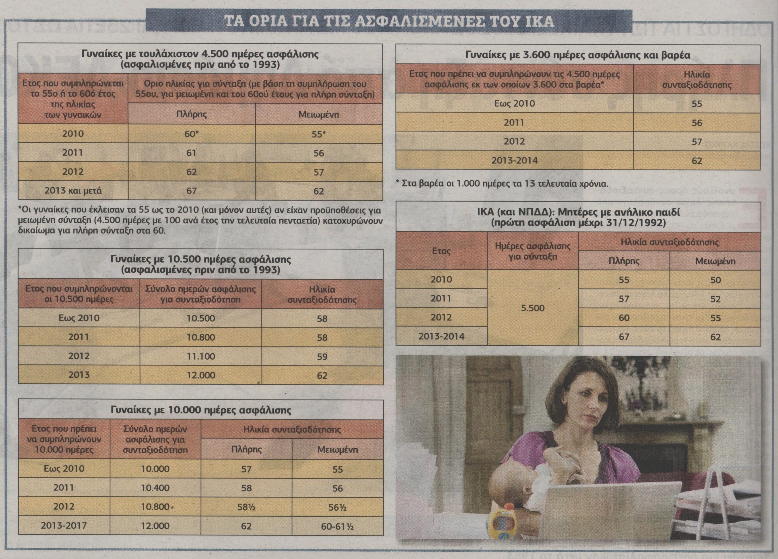 Σύνταξη σε ηλικίες 50 έως 60 ετών με μια σειρά από ευνοϊκές διατάξεις μπορούν να κατοχυρώνουν εκατοντάδες χιλιάδες γυναίκες που είναι ασφαλισμένες στα Ταμεία μισθωτών (ΙΚΑ, Δημόσιο, ΔΕΚΟ, τράπεζες), ελεύθερων επαγγελματιών (ΟΑΕΕ) και ανεξάρτητα απασχολουμένων (ΕΤΑΑ).