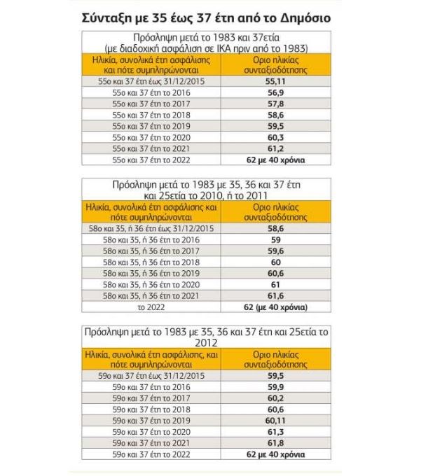 • Υπάλληλοι που διορίστηκαν μετά το 1983 και είχαν 25ετία έως το 2010, έπαιρναν σύνταξη χωρίς όριο ηλικίας με 37 έτη ασφάλισης. Με το νέο νόμο, όσοι συμπληρώνουν τα 37 χρόνια από 19/8/2015 και μετά συνταξιοδοτούνται αφού πρώτα κλείσουν τα 55 και ακολουθήσουν το αντίστοιχο όριο ηλικίας. Η διάταξη αυτή ευνοεί σχεδόν έναν στους τρεις υπαλλήλους του Δημοσίου που είχαν και ασφάλιση πριν από το 1983 εκτός Δημοσίου, οπότε τα 37 χρόνια συμπληρώνονται πιο γρήγορα. Για παράδειγμα, υπάλληλος που έχει 37 χρόνια το 2018, θα βγει όταν θα γίνει 58,5 ετών. Αν έχει τα 37 έτη το 2020, βγαίνει στα 61.
