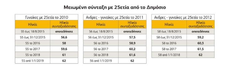 Οι δημόσιοι υπάλληλοι που δεν πιάνουν 35ετία ή 37ετία παίρνουν μειωμένη πριν από τα 62 αρκεί να έχουν 25ετία έως το 2012 και να συμπληρώνουν τα 55, 56, και 58 από 19/8/2015 έως το 2018. Τα όρια ηλικίας είναι ίδια για άνδρες και γυναίκες από το 2011 και μετά.
