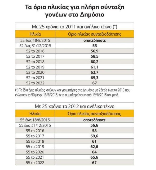 Οι γονείς δημόσιοι υπάλληλοι που έχουν τα 25 έτη έως το 2012 με ανήλικο παιδί, καθώς και όσοι απέκτησαν παιδί από το 2013 και μετά (με 25ετία όμως έως το 2012) συνταξιοδοτούνται με τα όρια ηλικίας που ισχύουν όταν συμπληρώσουν τα 50, 52 και 55, ως εξής: