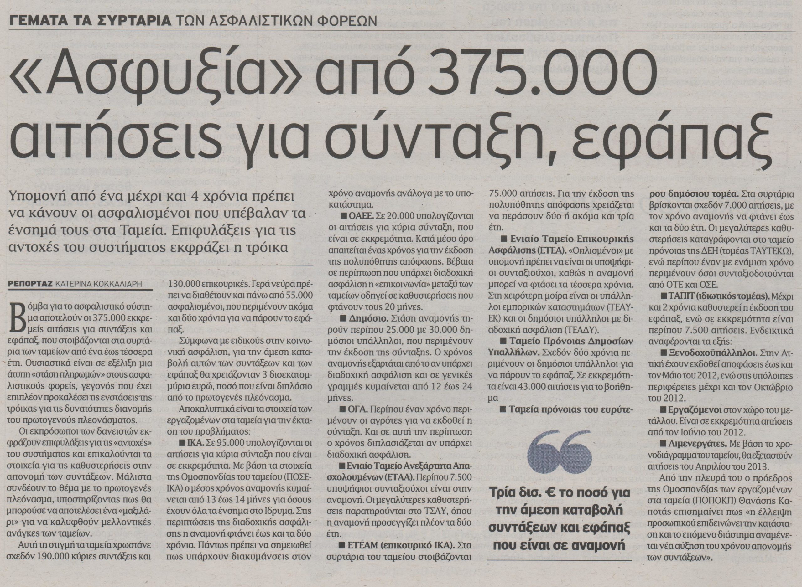 Βόμβα για το ασφαλιστικό σύστημα αποτελούν οι 375.000 εκκρεμείς αιτήσεις για συντάξεις και εφάπαξ, που στοιβάζονται στα συρτάρια των ταμείων από ένα έως τέσσερα έτη.