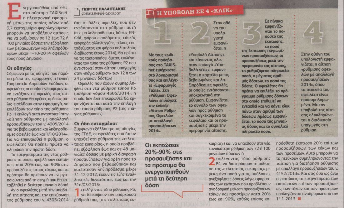 Ενεργοποιήθηκε από χθες, στο σύστημα TAXISnet, η ηλεκτρονική εφαρμογή μέσω της οποίας πάνω από 3,7 εκατομμύρια φορολογούμενοι μπορούν να υποβάλουν αιτήσεις για να ρυθμίσουν σε 12 έως 72 ή 100 μηνιαίες δόσεις την εξόφληση των βεβαιωμένων και ληξιπρόθεσμων μέχρι 1-10-2014 οφειλών τους προς το Δημόσιο.