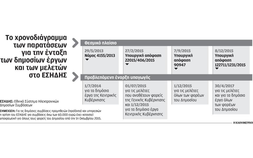 Ηλεκτρονικές δημόσιες συμβάσεις αλλά χωρίς σε αυτές να συμπεριλαμβάνει τα δημόσια έργα που θεωρούνται συχνά -όχι αβάσιμα- εστία διαπλοκής, διαφθοράς και κατασπατάλησης του δημοσίου χρήματος προωθεί η κυβέρνηση. Αν και από την 1η Οκτωβρίου 2015 όλοι οι διαγωνισμοί αξίας άνω των 60.000 ευρώ που αφορούν την προμήθεια προϊόντων και υπηρεσιών διενεργούνται υποχρεωτικά μέσω του Εθνικού Συστήματος Ηλεκτρονικών Δημοσίων Συμβάσεων (ΕΣΗΔΗΣ), τα δημόσια έργα και οι μελέτες έχουν εξαιρεθεί τουλάχιστον μέχρι και τον Απρίλιο του 2017. Η παράταση για την έναρξη ένταξης των δημοσίων έργων και μελετών, σύμφωνα με τον γενικό γραμματέα Εμπορίου και Προστασίας του Καταναλωτή κ. Αντώνη Παπαδεράκη που έχει και την ευθύνη για τη λειτουργία και διαχείριση του ΕΣΗΔΗΣ, χορηγήθηκε ύστερα από αίτημα του υπουργείου Υποδομών.