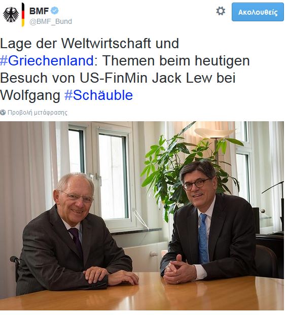 Στο Βερολίνο συναντήθηκαν ο υπουργός Οικονομικών της Γερμανίας Βόφγκανγκ Σόιμπλε και ο αμερικανός ομόλογός του Τζακ Λιου συζητώντας για την Ελλάδα.