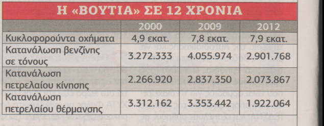 Είναι χαρακτηριστικό ότι τα καύσιμα κίνησης το 2012 μειώθηκαν τουλάχιστον κατά 11% σε σχέση με το 2000, παρά το γεγονός ότι τα οχήματα στην Ελλάδα σχεδόν διπλασιάστηκαν την τελευταία 12ετία.