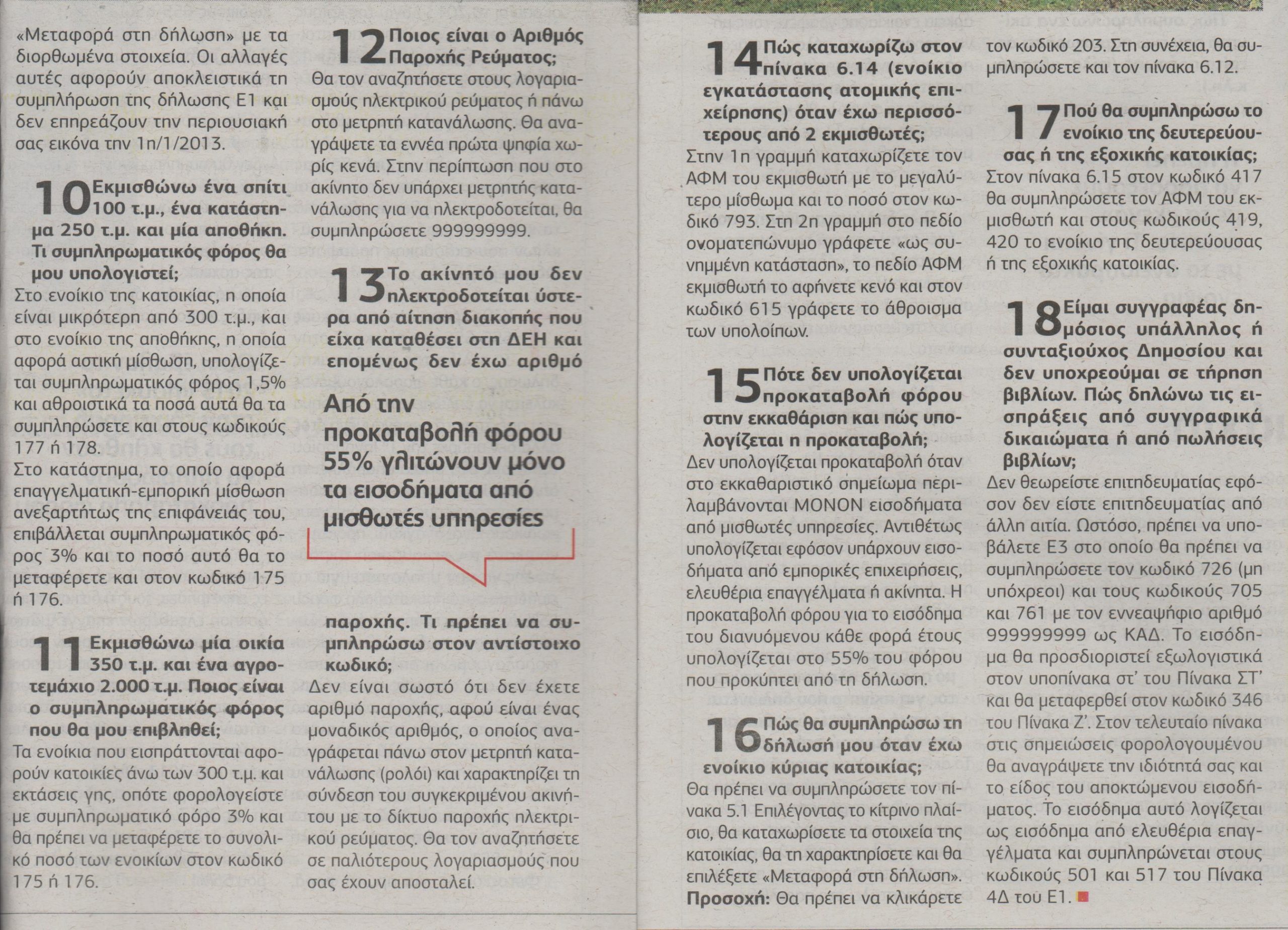 Επιπλέον, όσοι δηλώσουν για το 2013 εισοδήματα από εμπορικές επιχειρήσεις, ελεύθερα επαγγέλματα ή ακίνητα, πέραν του ότι θα πληρώσουν για τα εισοδήματα αυτά σημαντικά αυξημένους φόρους, λόγω της φορολόγησης με συντελεστές 10%, 26% και 33% από το πρώτο ευρώ, θα επιβαρυνθούν επιπλέον και με προκαταβολή φόρου 55%. Προκύπτει επίσης ότι τα εισοδήματα από ακίνητα θα επιβαρυνθούν και φέτος με συμπληρωματικό φόρο 1,5%-3%.