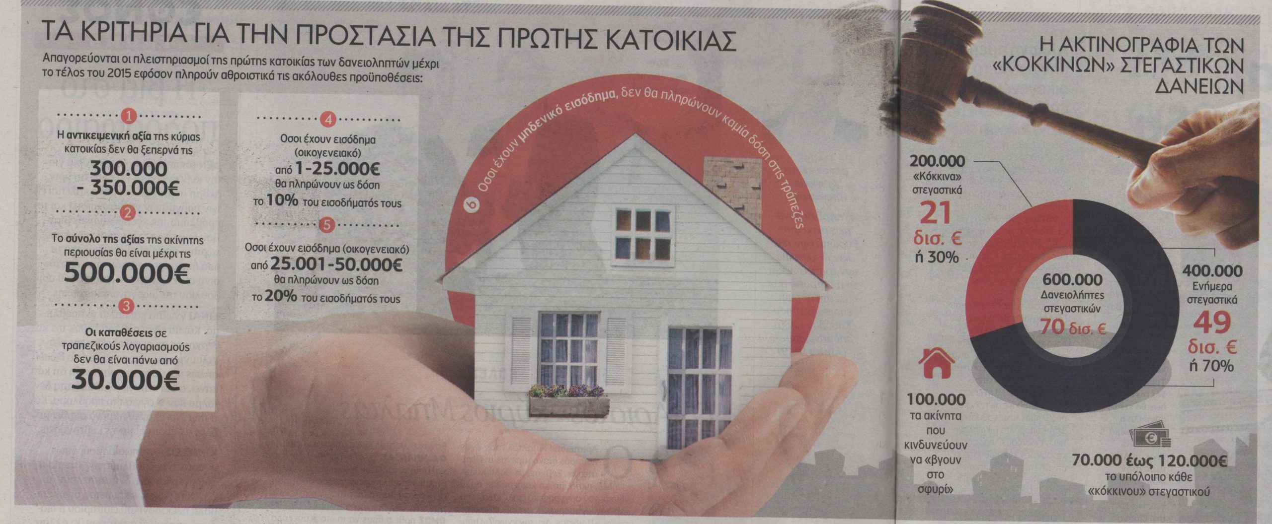 Φρένο στους πλειστηριασμούς της κύριας κατοικίας μέχρι το τέλος του 2015, αλλά με την υποχρέωση καταβολής δόσης προς τις τράπεζες, βάζει η κυβέρνηση, ενώ την ίδια στιγμή προετοιμάζει το σχέδιο για τις ρυθμίσεις «κόκκινων» στεγαστικών αλλά και επιχειρηματικών δανείων.