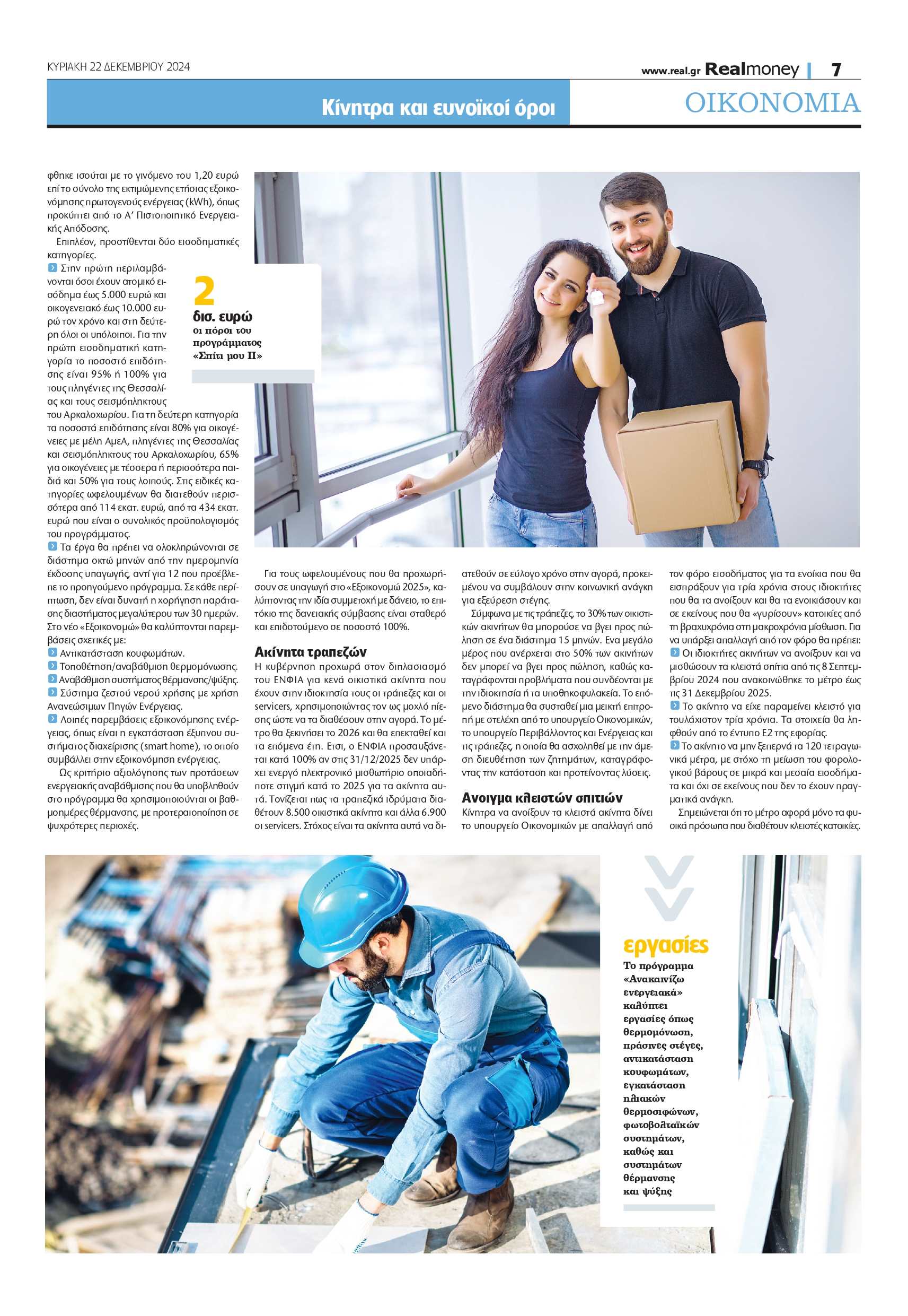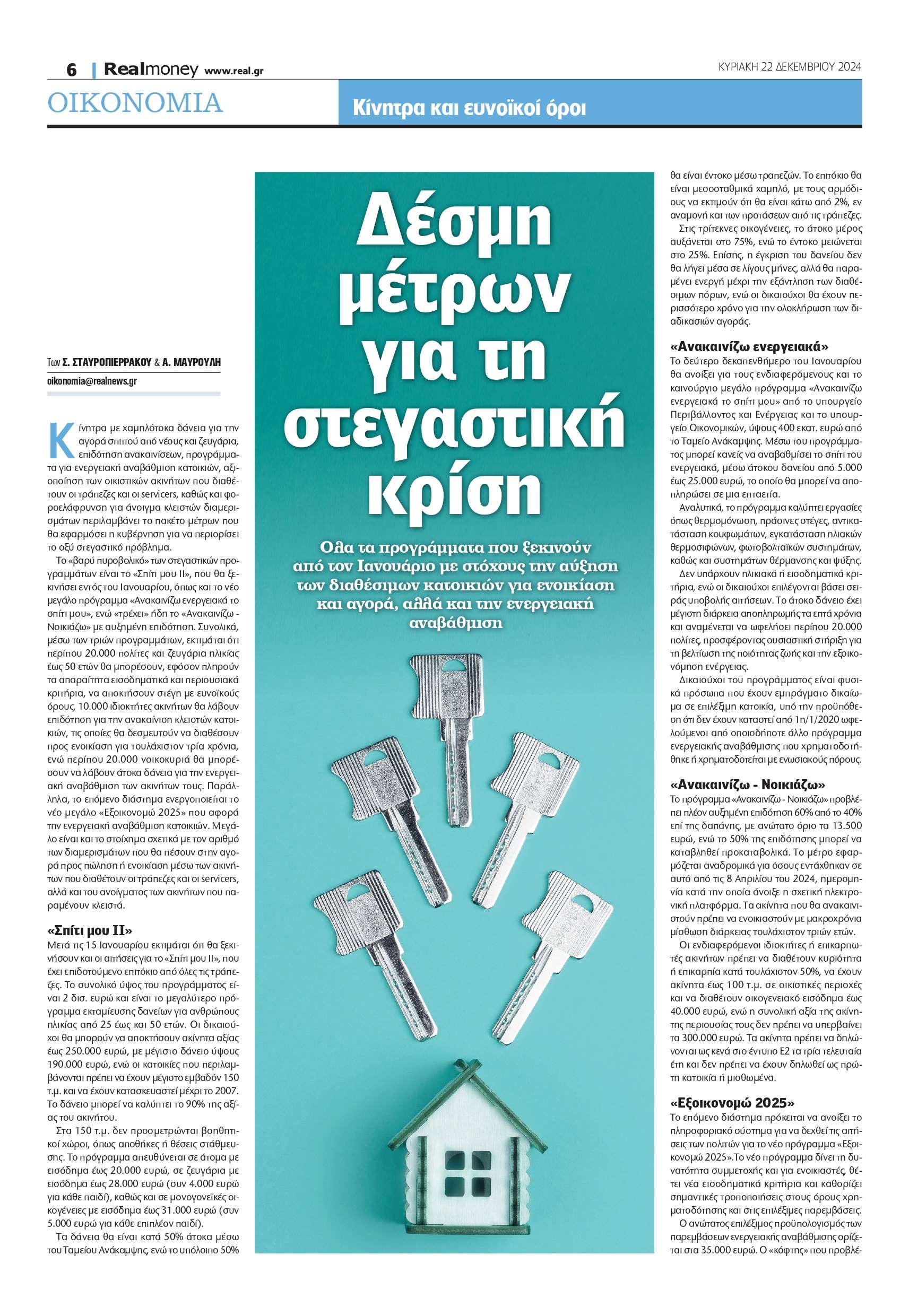 Το «βαρύ πυροβολικό» των στεγαστικών προγραμμάτων είναι το «Σπίτι μου ΙΙ», που θα ξεκινήσει εντός του Ιανουαρίου, όπως και το νέο μεγάλο πρόγραμμα «Ανακαινίζω ενεργειακά το σπίτι μου», ενώ «τρέχει» ήδη το «Ανακαινίζω – Νοικιάζω» με αυξημένη επιδότηση. Συνολικά, μέσω των τριών προγραμμάτων, εκτιμάται ότι περίπου 20.000 πολίτες και ζευγάρια ηλικίας έως 50 ετών θα μπορέσουν, εφόσον πληρούν τα απαραίτητα εισοδηματικά και περιουσιακά κριτήρια, να αποκτήσουν στέγη με ευνοϊκούς όρους, 10.000 ιδιοκτήτες ακινήτων θα λάβουν επιδότηση για την ανακαίνιση κλειστών κατοικιών, τις οποίες θα δεσμευτούν να διαθέσουν προς ενοικίαση για τουλάχιστον τρία χρόνια, ενώ περίπου 20.000 νοικοκυριά θα μπορέσουν να λάβουν άτοκα δάνεια για την ενεργειακή αναβάθμιση των ακινήτων τους. Παράλληλα, το επόμενο διάστημα ενεργοποιείται το νέο μεγάλο «Εξοικονομώ 2025» που αφορά την ενεργειακή αναβάθμιση κατοικιών. Μεγάλο είναι και το στοίχημα σχετικά με τον αριθμό των διαμερισμάτων που θα πέσουν στην αγορά προς πώληση ή ενοικίαση μέσω των ακινήτων που διαθέτουν οι τράπεζες και οι servicers, αλλά και του ανοίγματος των ακινήτων που παραμένουν κλειστά.