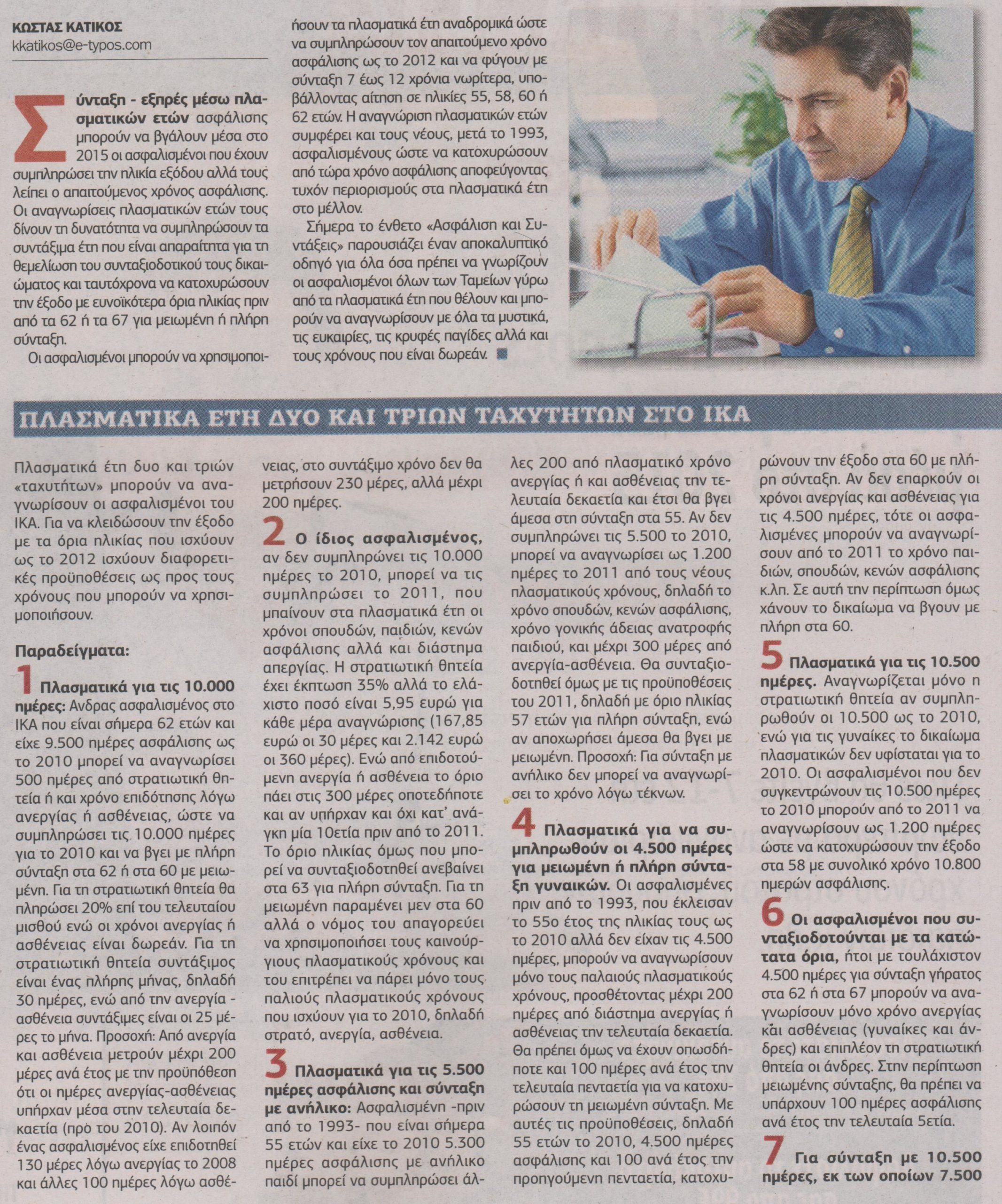Σύνταξη – εξπρές μέσω πλασματικών ετών ασφάλισης μπορούν να βγάλουν μέσα στο 2015 οι ασφαλισμένοι που έχουν συμπληρώσει την ηλικία εξόδου αλλά τους λείπει ο απαιτούμενος χρόνος ασφάλισης.