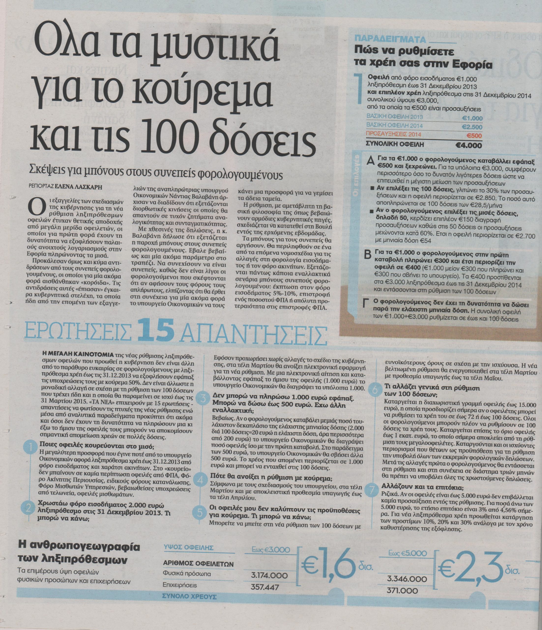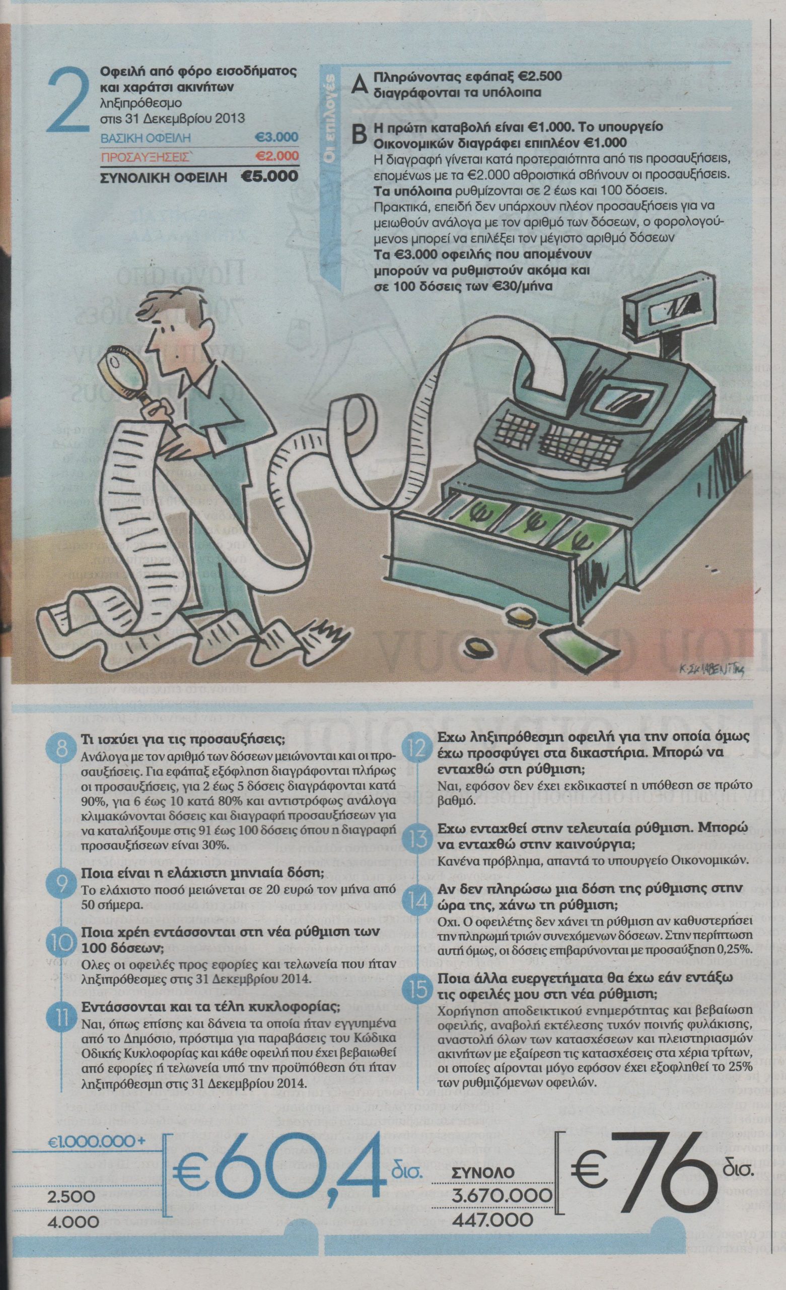 Οι εξαγγελίες των σχεδιασμών της κυβέρνησης για τη νέα ρύθμιση ληξιπρόθεσμων οφειλών έτυχαν θετικής αποδοχής από μεγάλη μερίδα οφειλετών, οι οποίοι για πρώτη φορά έχουν τη δυνατότητα να εξοφλήσουν παλαιούς ανοιχτούς λογαριασμούς στην εφορία, πληρώνοντας τα μισά.