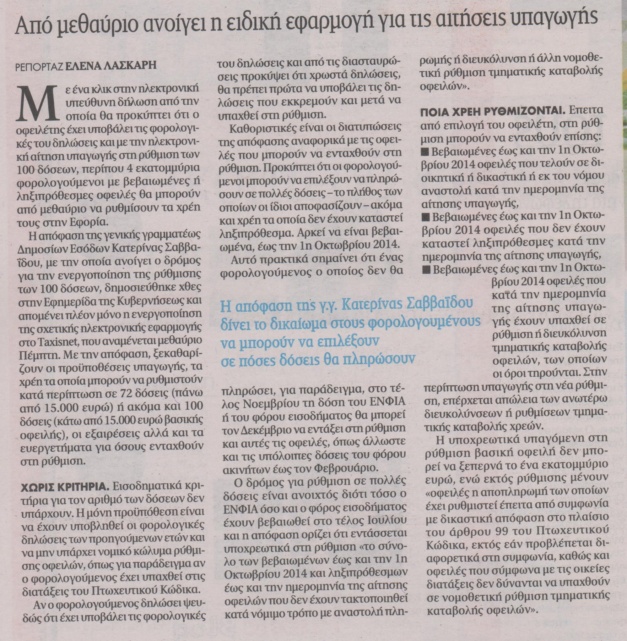 Η απόφαση της γενικής γραμματέως Δημοσίων Εσόδων, Κατερίνας Σαββαΐδου, με τη οποία ανοίγει ο δρόμος για την ενεργοποίηση της ρύθμισης των 100 δόσεων, δημοσιεύτηκε χθες στην Εφημερίδα της Κυβερνήσεως και απομένει πλέον μόνο η ενεργοποίηση της σχετικής ηλεκτρονικής εφαρμογής στο Taxisnet, που αναμένεται μεθαύριο Πέμπτη.