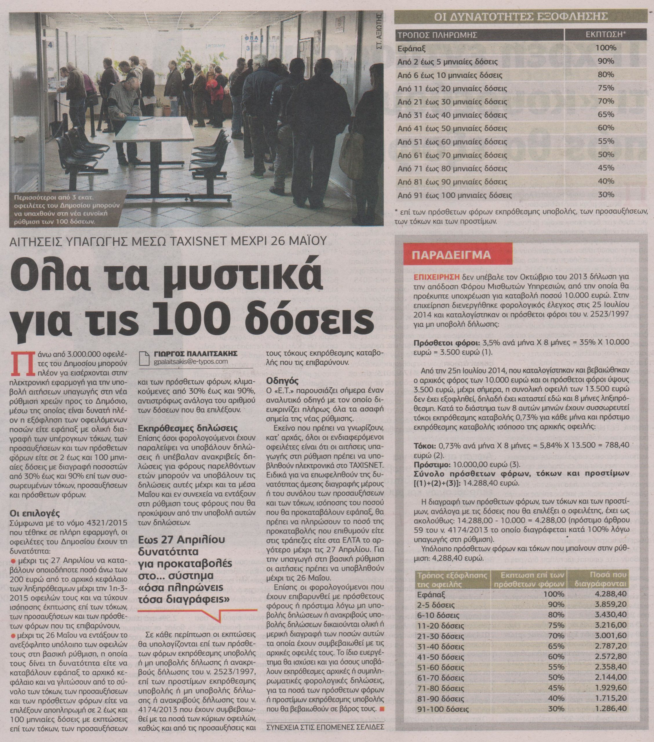 - μέχρι τις 27 Απριλίου να καταβάλουν οποιοδήποτε ποσό άνω των 200 ευρώ από το αρχικό κεφάλαιο των ληξιπρόθεσμων μέχρι την 1η- 3- 2015οφειλών τους και να τύχουν ισόποσης έκπτωσης επί των τόκων, των προσαυξήσεων και των πρόσθετων φόρων που τις επιβαρύνουν,