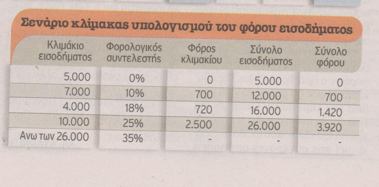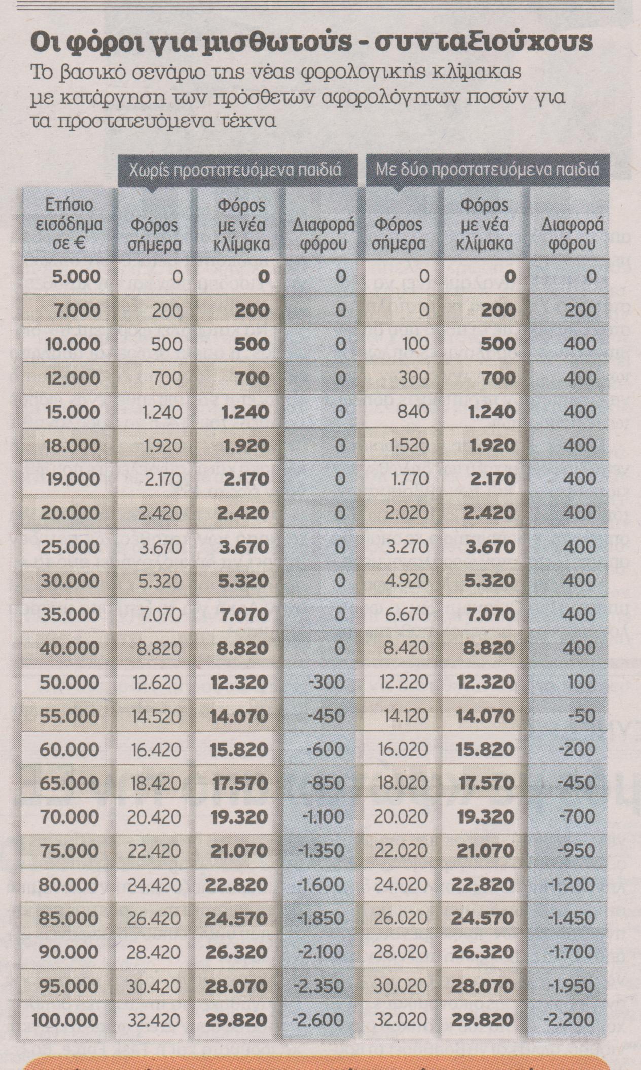 Νέο σχέδιο για την κλίμακα φορολογίας εισοδήματος των μισθωτών και των συνταξιούχων επεξεργάζεται το υπουργείο Οικονομικών. Το νέο σχέδιο προβλέπει περιορισμό των φορολογικών κλιμακίων, από οκτώ που είναι σήμερα σε πέντε, με μείωση του ανώτατου φορολογικού συντελεστή από 45%, στο 35%, για τα εισοδήματα, πάνω από τα 26.000 ευρώ.Στην κλίμακα φορολογίας εισοδήματος των μισθωτών και συνταξιούχων, οι συντελεστές φόρου 38%, 40% και 45%, οι οποίοι αντιστοιχούν στα φορολογικά κλιμάκια από τις 40.000 ευρώ και πάνω, καταργούνται και αντικαθίστανται από έναν ενιαίο συντελεστή 35%. Αυτό σημαίνει ότι:- στο κλιμάκιο εισοδήματος από τις 40.000,01 έως τις 60.000 ευρώ ο συντελεστής φόρου μειώνεται από 38% σε 35%- στο τμήμα του εισοδήματος από τις 60.000 έως τις 100.000 ευρώ ο συντελεστής φόρου μειώνεται από 40% σε 35%- στο κλιμάκιο εισοδήματος πάνω από τις 100.000 ευρώ ο συντελεστής φόρου μειώνεται από 45% σε 35%.Καταργούνται πλήρως τα πρόσθετα αφορολόγητα όρια για τα προστατευόμενα τέκνα. Τα όρια αυτά ανέρχονται σε 2.000 ευρώ για κάθε ένα από τα δύο πρώτα τέκνα και σε 3.000 ευρώ για κάθε τέκνο από το τρίτο και τα επόμενα.Δείτε τους πίνακες με τους φόρους για μισθωτούς και συνταξιούχους.