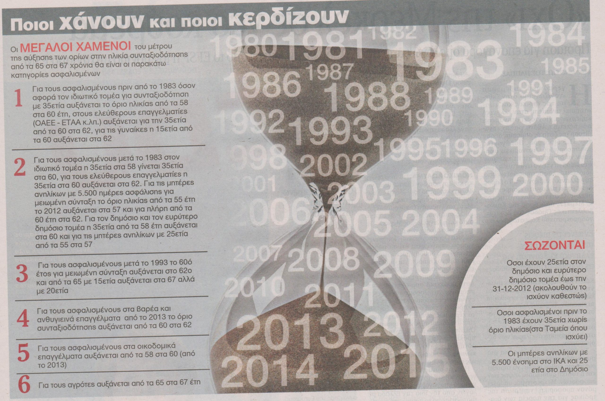 Αύξηση των ορίων συνταξιοδότησης από τα 65 στα 67 έτη, από το 2013, προβλέπει το νέο νομοσχέδιο, μαζί με τις περικοπές στις συντάξεις και στο εφάπαξ. «Χαμένοι» του νέου μέτρου, θα είναι όσοι δεν έχουν προλάβει να θεμελιώσουν συνταξιοδοτικό δικαίωμα, ενώ το μέτρο, θα συμπαρασύρει και τα ενδιάμεσα όρια ηλικίας.