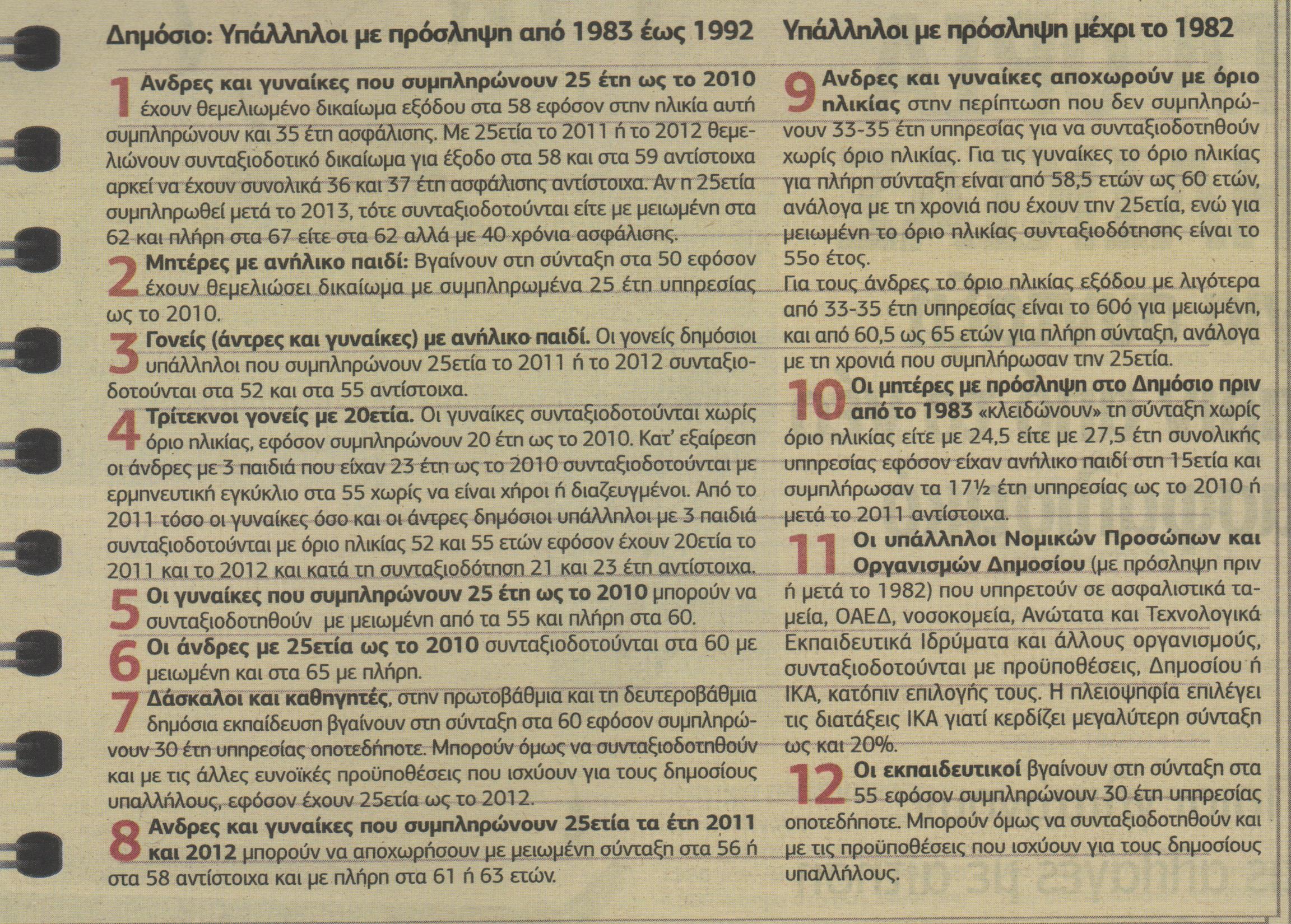Διαβάστε τον πλήρη συνταξιοδοτικό οδηγό με τα όρια ηλικίας όλων των Ταμείων καθώς και τις ευκαιρίες της «τελευταίας στιγμής» που μπορούν να εκμεταλλευτούν οι ασφαλισμένοι για θεμελίωση ή κατοχύρωση συνταξιοδοτικού δικαιώματος μέσα σε 60 μέρες πριν από τις αλλαγές του 2015, από τον Ελεύθερο Τύπο: