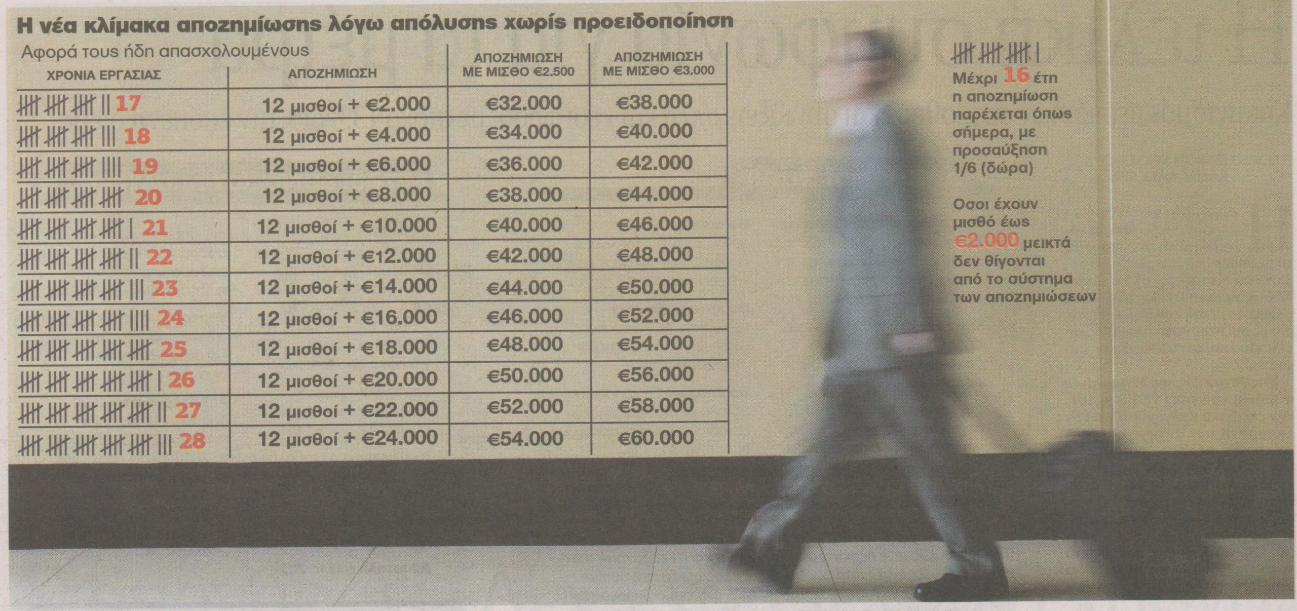 Ειδικότερα, ο χρόνος προειδοποίησης απόλυσης ορίστηκε στους 4 μήνες, ενώ σε ό,τι αφορά τους εργαζόμενους με 17 χρόνια και πάνω, στην αποζημίωση των 12 μισθών θα προστίθεται ένας μισθός για κάθε χρόνο μετά τον 16ο, με ανώτατο πλαφόν στον μισθό επί του οποίου θα υπολογίζεται η αποζημίωση τα 2000 ευρώ.